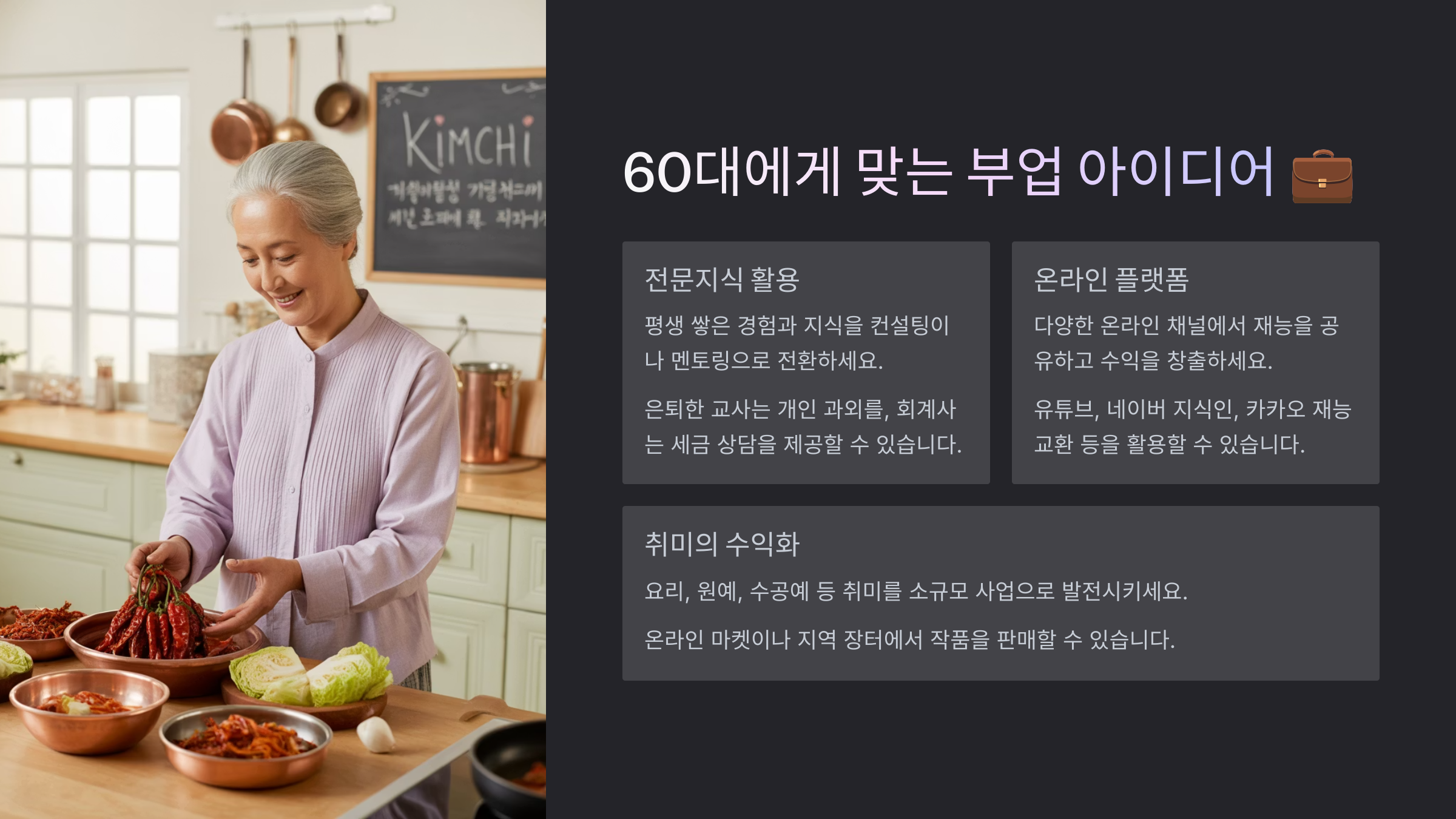 60대에게 맞는 부업 아이디어 노후 재테크에서 ‘부업’은 단순한 소득 이상의 의미를 가져요. 생활비 보조는 물론이고, 활력과 자존감을 동시에 높여주는 긍정적인 효과가 있어요. 체력이나 기술 수준에 따라 누구나 도전할 수 있는 부업이 정말 많답니다.