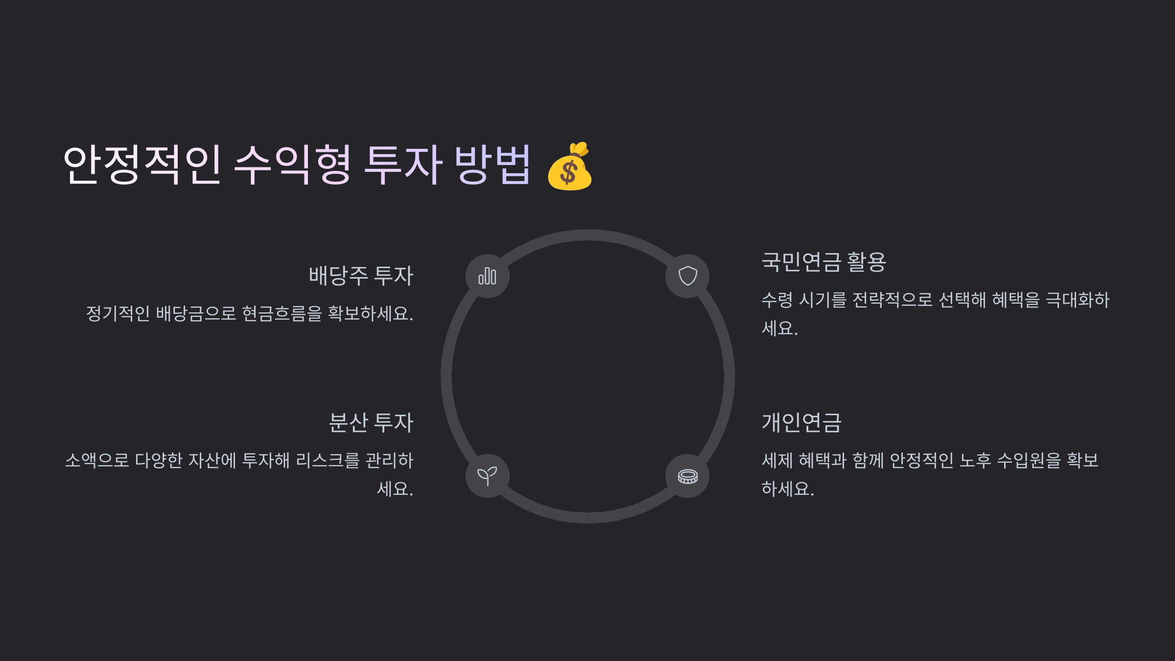 A3. 정기예금, 채권형 ETF, 월 배당형 REITs 같은 상품이 좋아요. 원금 손실 위험이 적고, 일정 수익을 기대할 수 있어요.