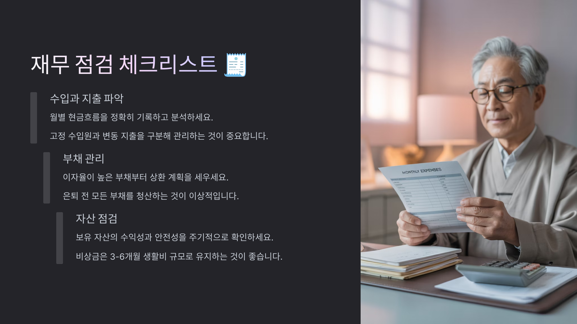 부채도 반드시 확인해야 해요. 주택담보대출, 신용대출, 카드론 등이 남아 있다면 상환 계획을 세워야 해요. 이자만 내고 있다면 원금까지 갚을 수 있는 방식을 고민해보고, 불필요한 대출은 빨리 정리하는 게 좋아요. 퇴직 이후에는 대출이 오히려 큰 부담이 되거든요.