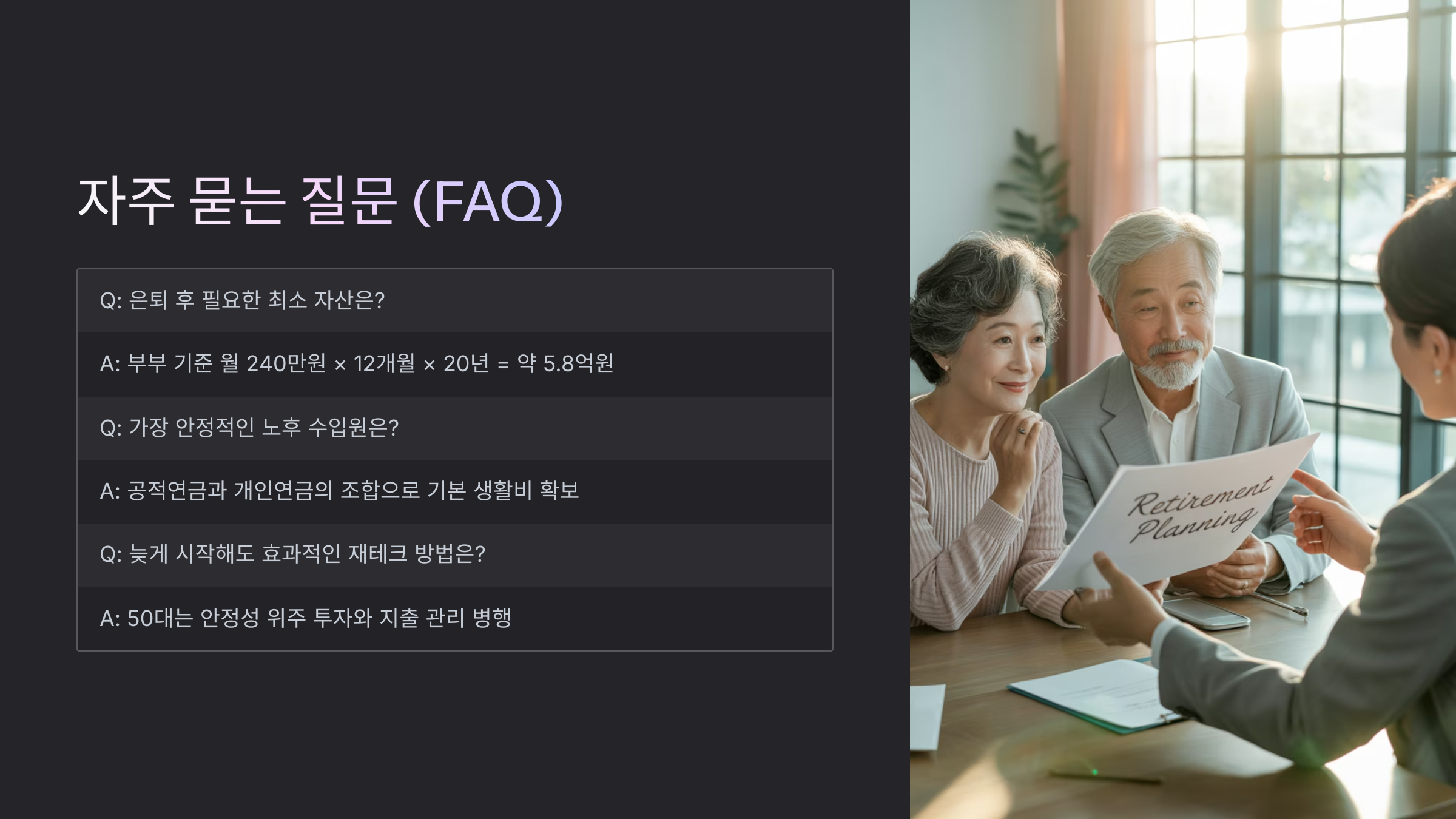 항목 점검 내용 체크 자산 부동산, 예금, 주식 등 총액 계산 ✅ 고정 수입 연금, 부업 수익, 이자 등 ✅ 지출 생활비, 공과금, 보험료 등 ✅ 부채 대출 상환계획 여부 ✅ 보험 실손/의료보험 갱신 확인 ✅ 이 체크리스트를 기반으로 현재 상황을 한눈에 파악하면, 어떤 부분을 보완해야 할지 명확해져요. 돈을 모으는 것도 중요하지만, 지키는 것도 그만큼 중요하답니다. 이제 마지막으로 많이 궁금해하시는 질문들을 모은 FAQ로 정리해드릴게요! 😊