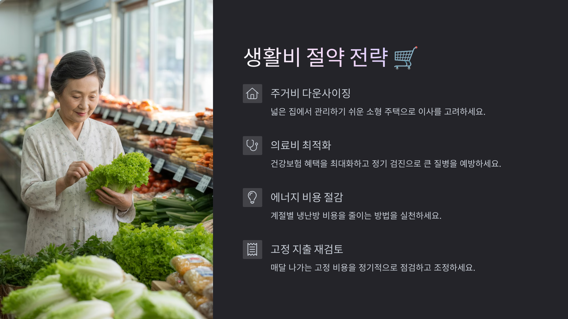 생활비 절약 전략 노후 자산이 부족한 상황이라면 먼저 '세는 돈'부터 막는 게 가장 중요해요. 즉, 생활비 절감은 재테크의 첫 단추예요. 무조건 아끼기보다는 똑똑하게 줄이는 방법을 통해 스트레스를 최소화하면서도 지출을 줄일 수 있어요.
