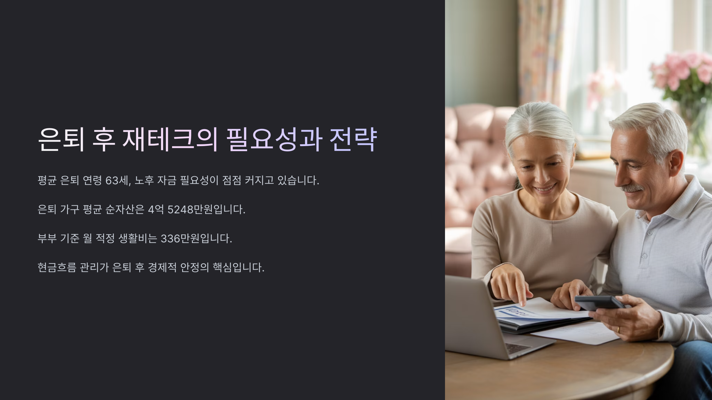 60세를 기준으로 은퇴하더라도 최소 20~30년은 더 살아가야 해요. 이 기간 동안 필요한 생활비, 의료비, 취미비용 등을 생각하면 적은 자산으로는 감당하기 어려워요. 그래서 퇴직 이후에도 일정한 수익이 생기는 구조를 만드는 것이 핵심이에요.은퇴 전에는 급여라는 정기적인 수입원이 있었지만, 이제는 그마저도 없죠. 그렇다고 소비를 줄이기만 하는 건 한계가 있어요. 그래서 수익과 지출의 균형을 새롭게 잡는 재테크 전략이 꼭 필요해요.