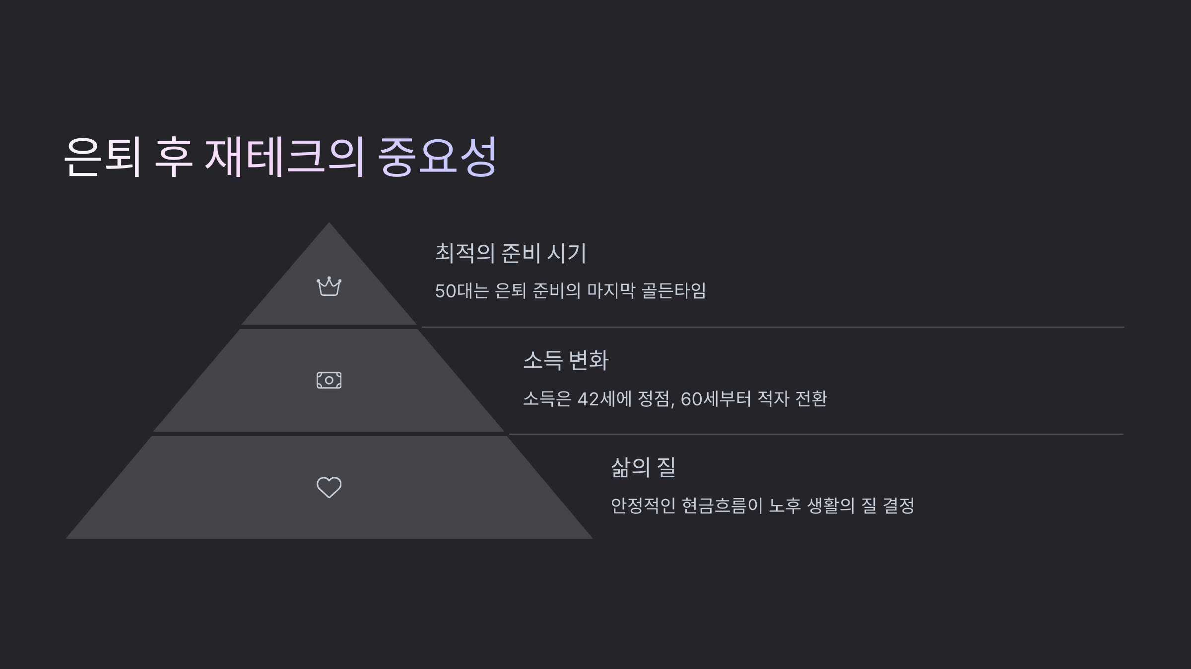 이제부터 본격적으로 '은퇴 후 재테크의 필요성'부터 알아보도록 해요. 이후 항목들은 다음 코드블럭에서 자동으로 이어서 나올 거예요. 👇