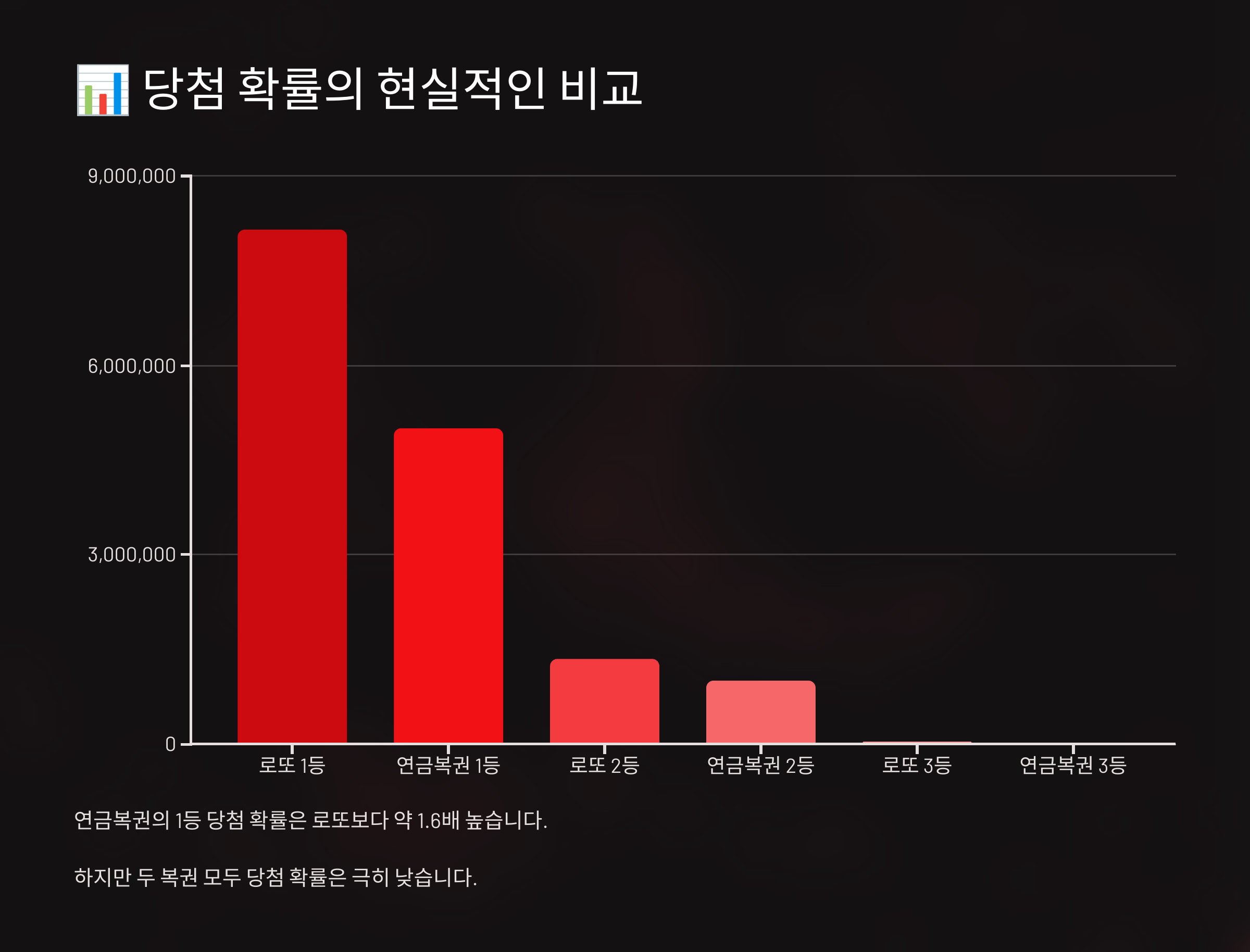 로또와 연금복권을 비교할 때 가장 많이 이야기되는 부분이 바로 당첨 확률이에요. 쉽게 말하면 ‘내가 진짜 당첨될 수 있을까?’ 하는 현실적인 궁금증이죠. 로또 1등의 확률은 1/8,145,060이고, 연금복권 1등의 확률은 1/1,260,000이에요. 숫자만 봐도 확연한 차이가 느껴지죠? 🧮정확히 계산하면 연금복권이 로또보다 약 6.47배 더 당첨될 확률이 높아요. 예를 들어 로또는 서울 월드컵 경기장(약 6만 6천 석)에 앉아 있는 관중 중 단 1명이 당첨되는 정도라면, 연금복권은 여의도 공원 정도에 모인 사람 중에서 한 명이 뽑히는 정도랄까요? 확률적으로나 감정적으로나 연금복권이 더 ‘닿을 듯한’ 느낌이 있어요. 🤏
