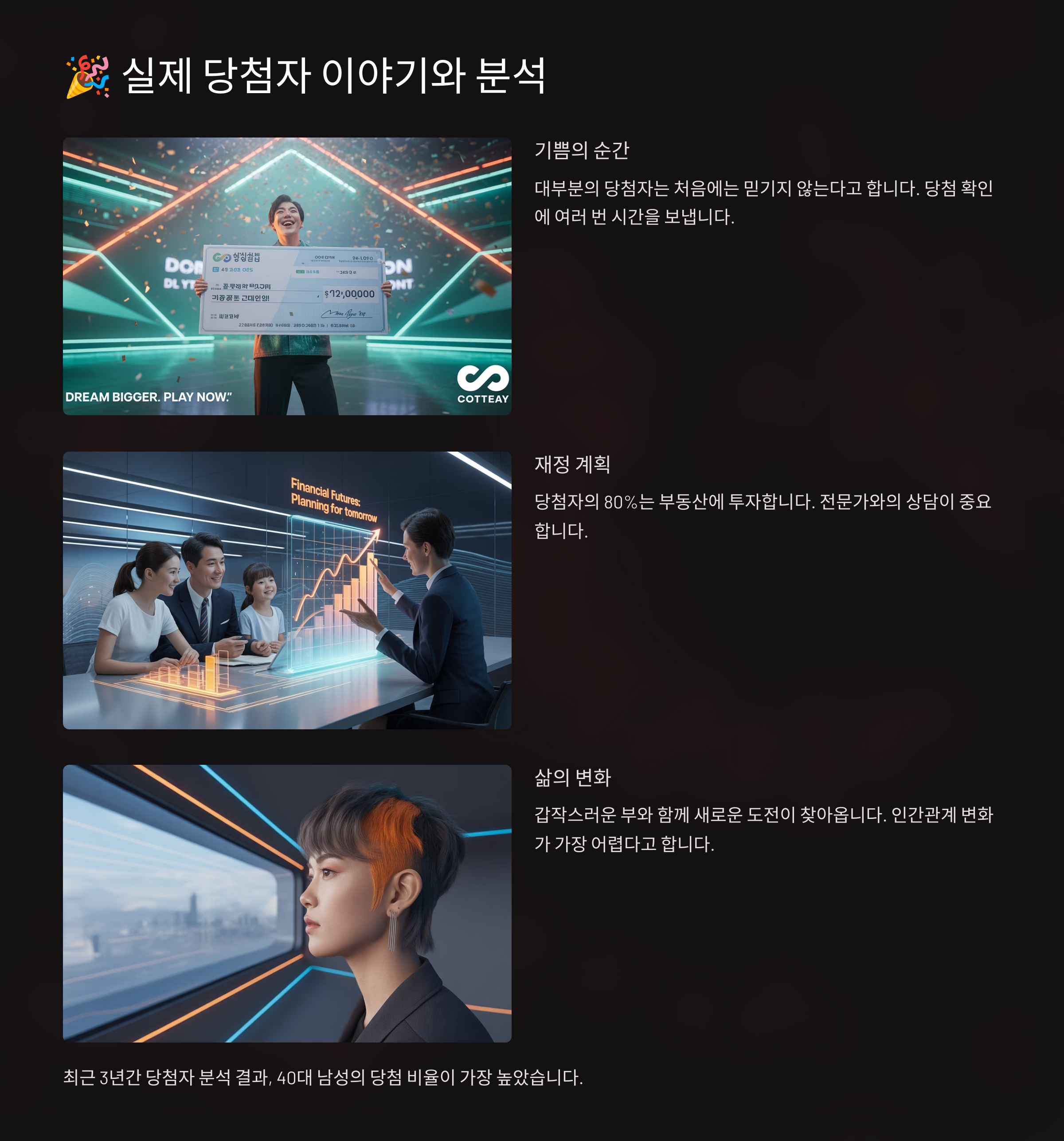 로또나 연금복권의 당첨 확률이 아무리 낮다고 해도, 매주 누군가는 당첨되고 있다는 건 사실이에요. 그렇다면 진짜로 1등에 당첨된 사람들은 어떤 삶을 살고 있을까요? TV 프로그램이나 뉴스, 커뮤니티에서 종종 당첨자들의 사연이 소개되곤 하는데요, 그 이야기들을 바탕으로 현실적인 면모를 살펴볼게요.로또 1등에 당첨된 A씨는 30대 중반의 직장인이었어요. 평소에도 로또를 꾸준히 사던 그는 어느 날 퇴근길에 무심코 산 복권에서 6개 숫자가 모두 맞는 걸 보고 인생이 바뀌었다고 해요. 하지만 거액을 한 번에 손에 쥐고 나서 겪은 심리적 부담은 상상 이상이었다고 털어놨죠. 주변 지인들의 태도 변화, 투자 사기, 가족 간 갈등 등도 함께 찾아왔다고 해요.