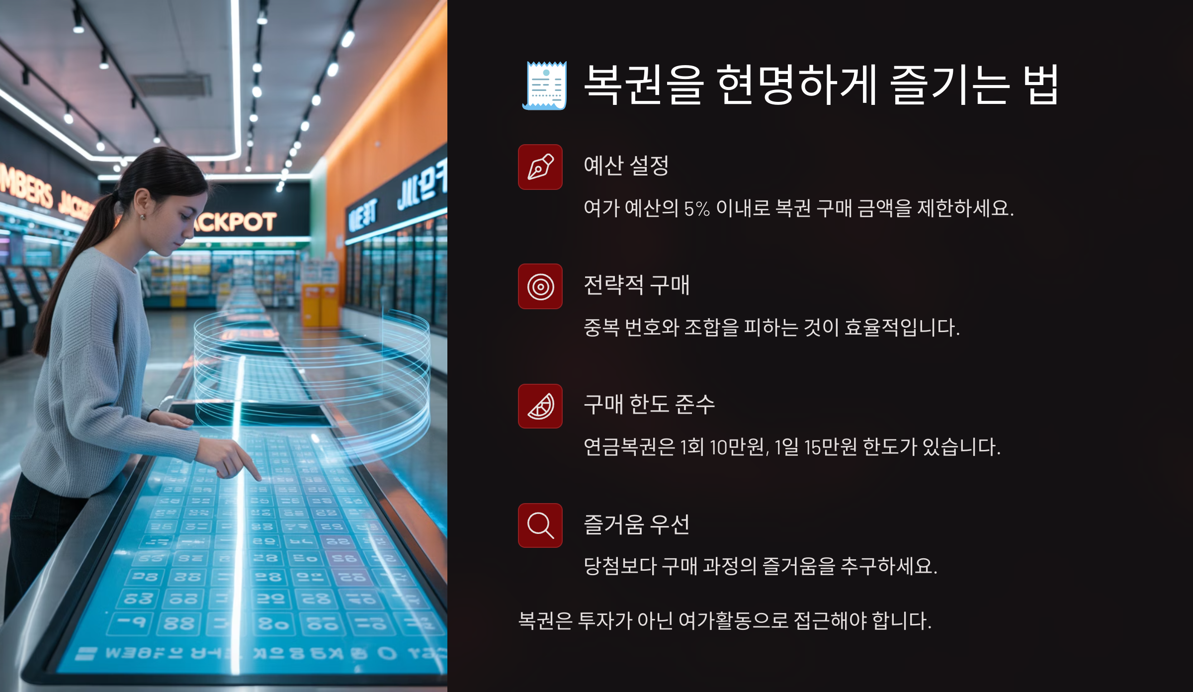 복권은 적절히 즐기면 일상의 활력소가 되지만, 지나치게 의존하면 스트레스로 변할 수 있어요. 그래서 중요한 건 '복권을 어떻게 사느냐'보다는 '어떤 태도로 대하느냐'예요. 이 섹션에서는 복권을 즐겁고 똑똑하게 소비하는 방법을 정리해볼게요. 🎯첫째, 예산을 정해서 사는 게 가장 중요해요. 복권은 투자나 저축이 아니라 소비라는 인식을 가져야 해요. 한 달 예산 내에서 커피 한두 잔 줄이는 정도로 생각하면 스트레스도 없고, 부담도 없죠. 보통 월 1~2만 원 정도가 가장 부담 없이 즐길 수 있는 수준이에요.