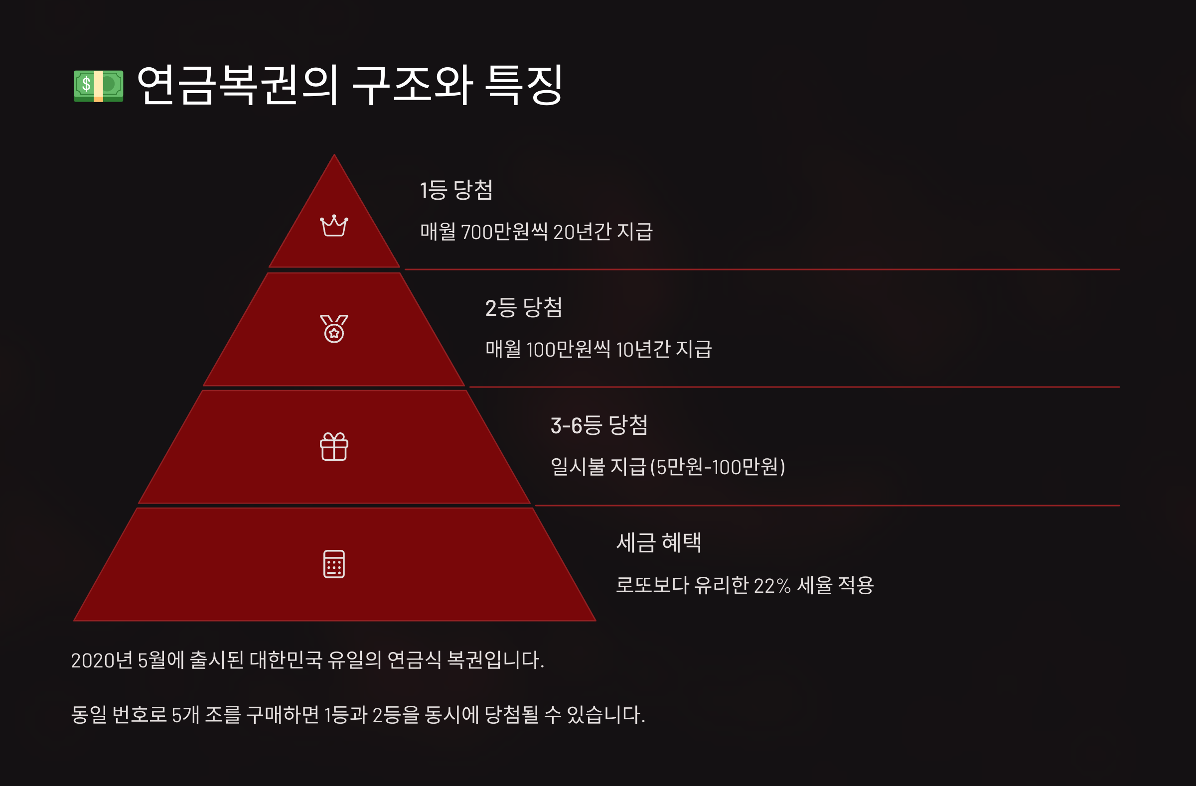 연금복권의 구조와 특징 연금복권은 한 번에 큰돈을 받는 로또와는 다르게, 일정 기간 동안 매달 안정적인 수입을 받을 수 있다는 점이 큰 장점이에요. 2011년에 처음 등장했으며, 현재는 '연금복권720+'라는 이름으로 매주 수요일에 추첨을 진행하고 있어요. 구조도 꽤 간단해요. 각 조별로 1등 번호가 하나씩 정해지고, 총 5조 1등이 당첨되면 각각 월 700만 원씩 20년간 총 16억 8천만 원을 받게 되죠. 🤑