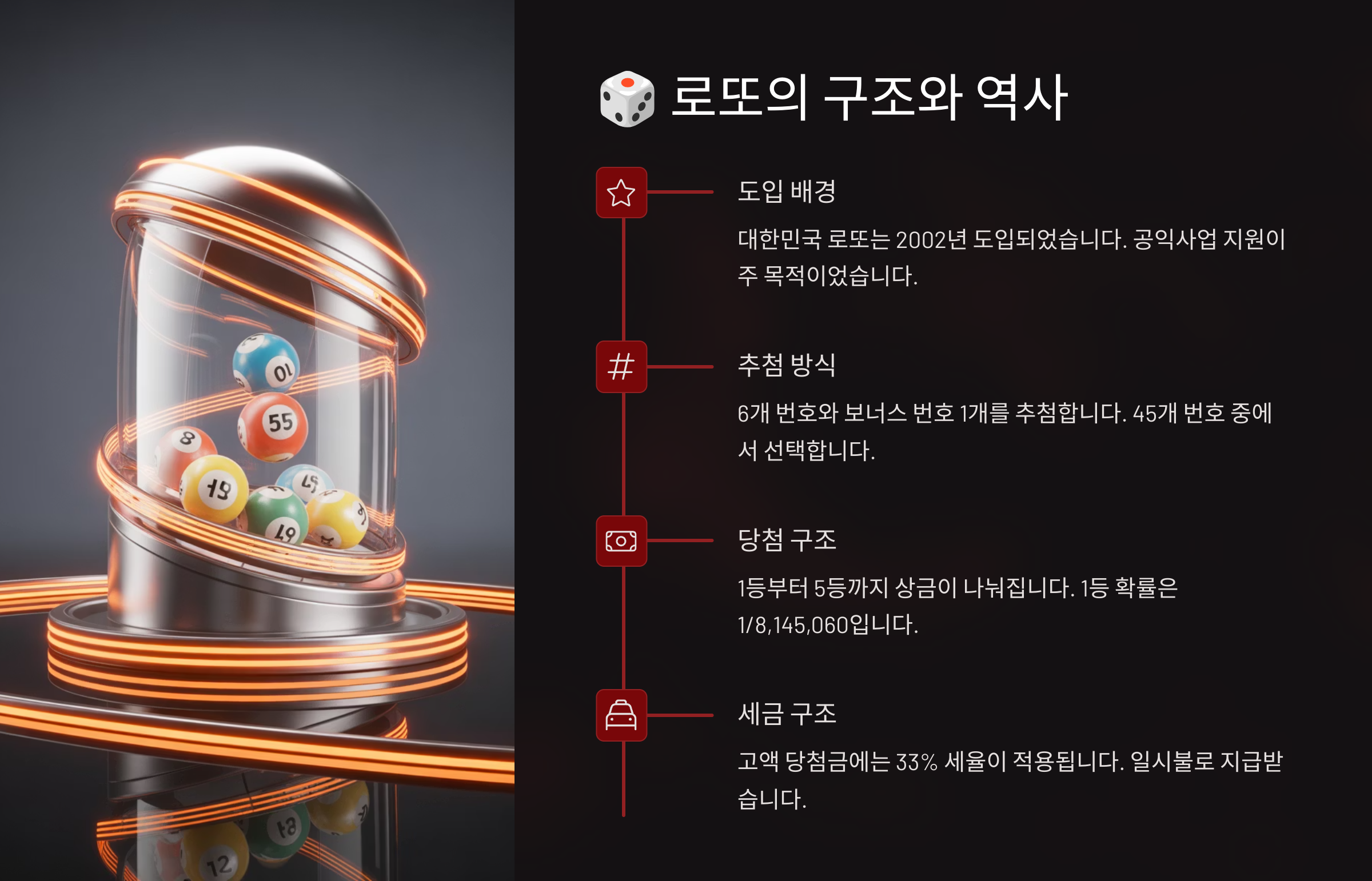 로또는 2002년 12월 7일, 제1회 로또 추첨을 시작으로 한국에서 대중화되었어요. 매주 토요일마다 방송을 통해 생중계되고 있으며, 판매금 중 일정 비율이 공익기금으로 활용되는 구조죠. 1등은 6개 숫자를 정확히 맞춰야 하는데, 45개의 숫자 중에서 6개를 고르는 방식이라 총 조합 수는 무려 8,145,060가지나 돼요. 💸로또는 매주 1등 당첨자가 1명 이상 나오는 경우가 많지만, 1등이 없으면 이월이 되어 다음 회차에 금액이 더 커지는 시스템이에요. 이게 바로 많은 사람들이 '한방'을 노리고 사게 되는 이유 중 하나죠. 1등 외에도 2등(보너스 숫자 포함), 3등(5개 숫자 일치), 4등, 5등까지 다양한 등수가 있어서 완전 꽝은 덜하다고 생각할 수도 있어요.
