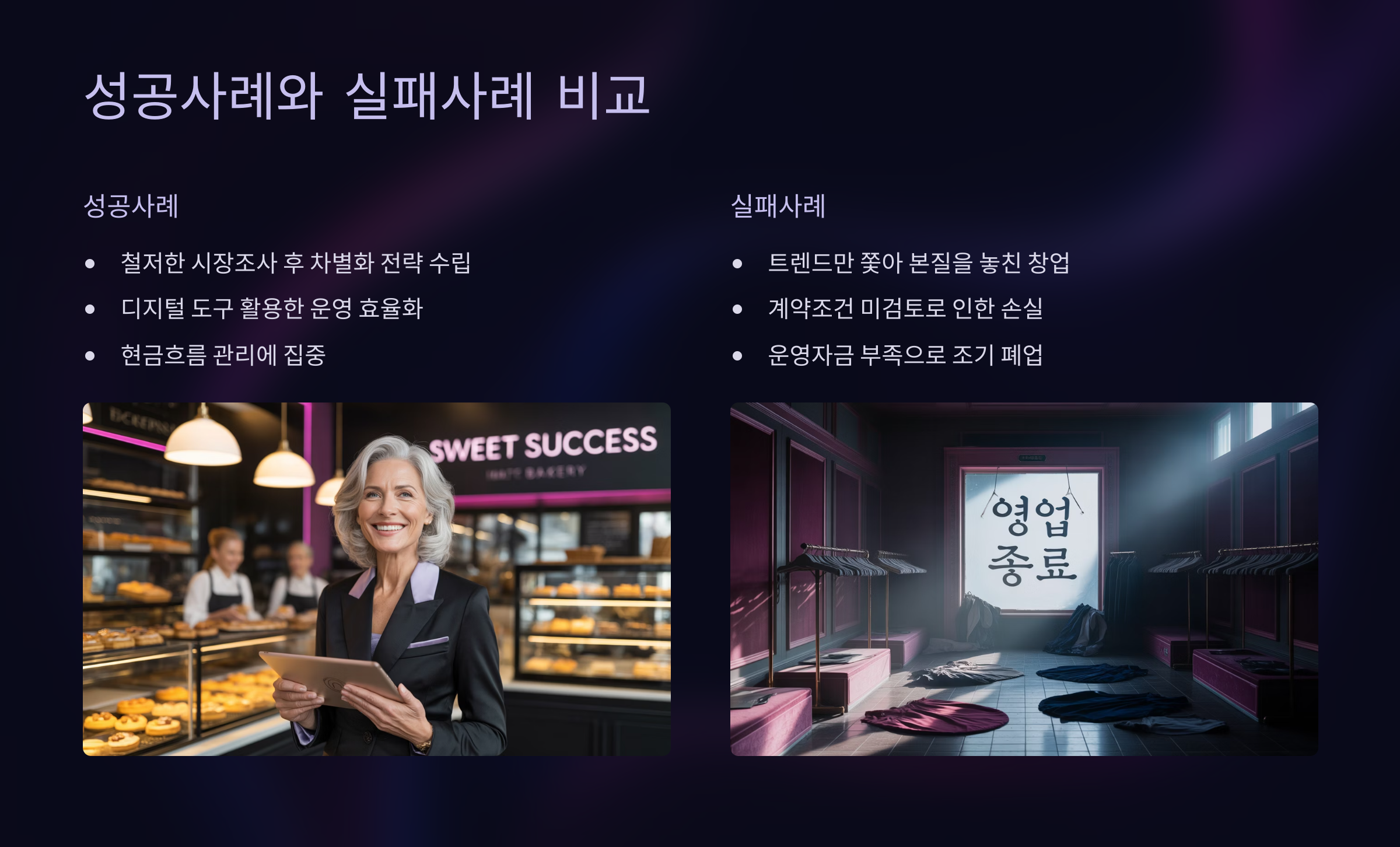 또한, 성공 사례는 대부분 ‘소규모로 시작’했어요. 무리한 대출 없이 작은 규모로 사업을 실험하고, 반응을 보며 점차 키워 나가는 전략을 썼어요. 반면, 실패 사례는 처음부터 크게 벌여놓고 매출이 나오지 않으면 감당이 안 되는 구조였죠.