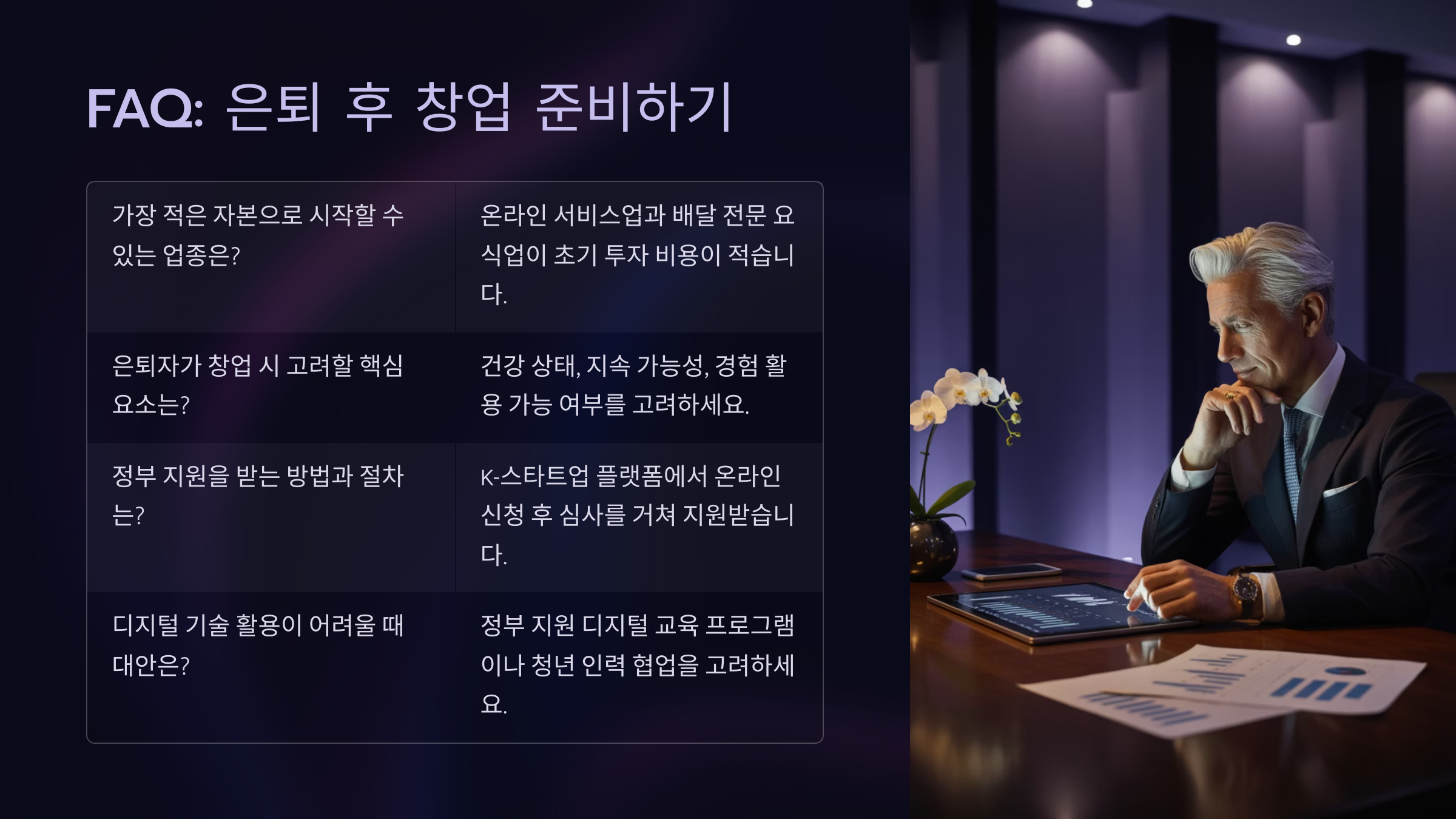Q1. 은퇴 후 소자본으로 가능한 창업은 어떤 게 있나요?A1. 스마트스토어, 배달전문점, 원데이 클래스, 지역특산물 판매, 중고거래 플랫폼 창업 등 자본이 적어도 가능한 업종이 많아요. 플랫폼만 잘 활용하면 충분히 운영할 수 있어요.