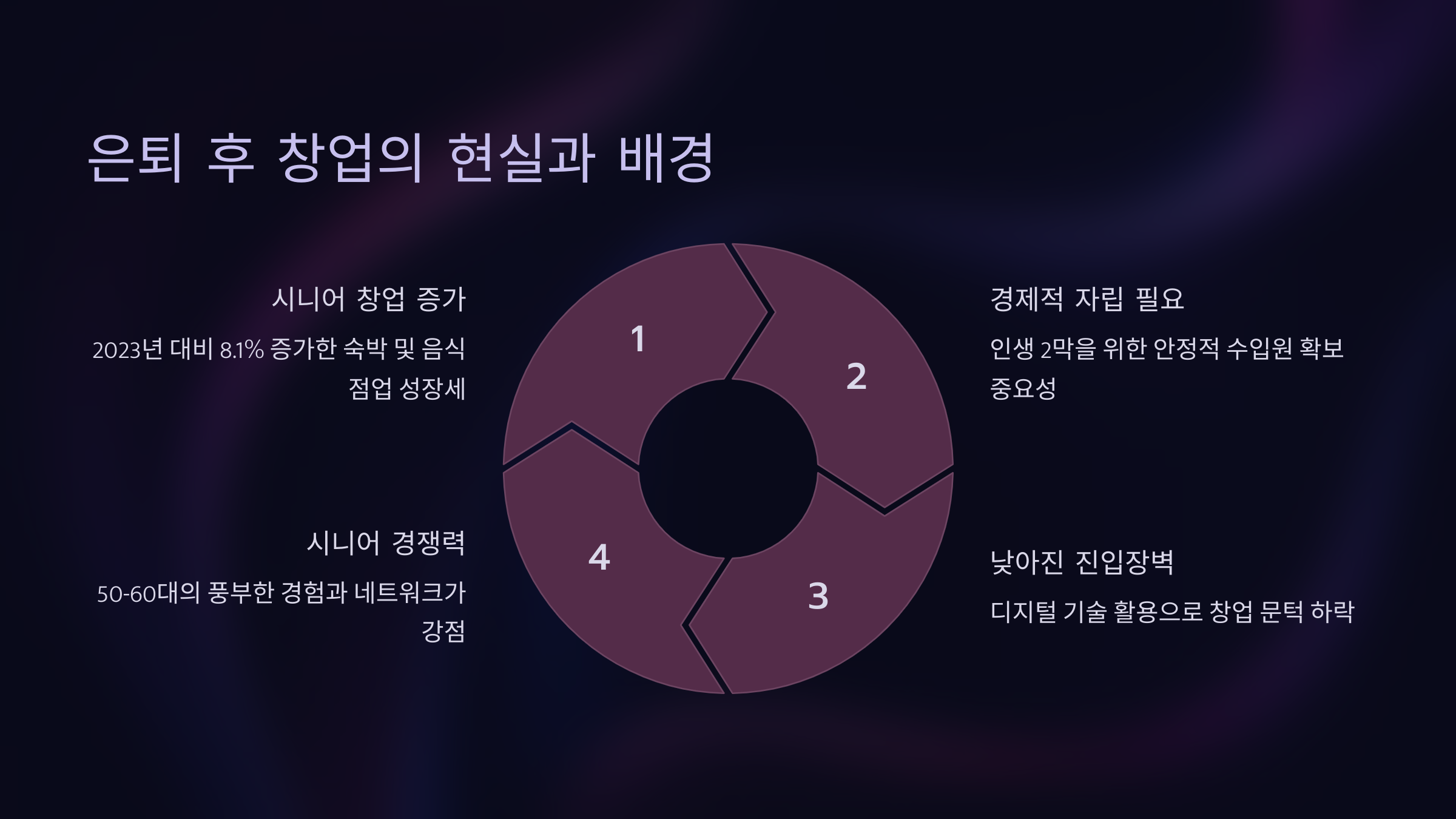 구분 비율(%) 설명 경제적 이유 62% 노후 대비, 추가 수익 필요 시간 활용 19% 은퇴 후 무료함 해소 경험 활용 14% 기존 전문성 발휘 자아실현 5% 새로운 도전, 성취감 이 표에서 보듯, 단순히 돈을 벌기 위해 창업을 시작하는 경우가 많지만, 실제로는 삶의 의미를 찾거나, 사회와 계속 연결되고 싶어서 시작하는 경우도 많아요. 각자만의 이유가 있답니다 😊
