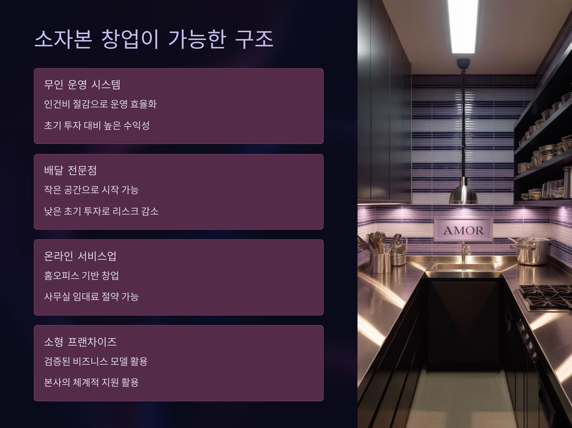 소자본 창업은 말 그대로 초기 비용이 적게 드는 사업을 의미해요. 하지만 단순히 적은 돈만으로 창업할 수 있다는 의미는 아니에요. 중요한 건 구조예요. 어떻게 하면 적은 자금으로 사업을 시작하고 유지할 수 있는지에 대한 전략이죠.우선, ‘고정비용’을 최소화해야 해요. 가장 큰 고정비는 임대료와 인건비예요. 그래서 무점포, 1인 창업이 각광받고 있는 거예요. 공간이 없거나, 혼자 일할 수 있는 구조면 매달 나가는 돈이 현저히 줄어들죠. 대표적으로 온라인 쇼핑몰, 배달 전문점, 홈쿠킹 클래스 등이 이에 해당해요.