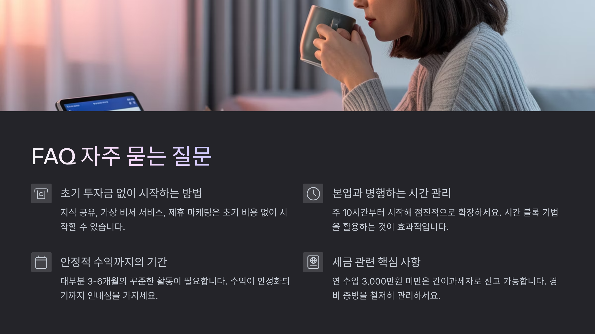 A8. 당연히 가능해요! 처음엔 작게 시작해도, 구조만 잘 만들면 퇴직 전보다 더 자유롭고 여유 있는 생활이 가능해져요.