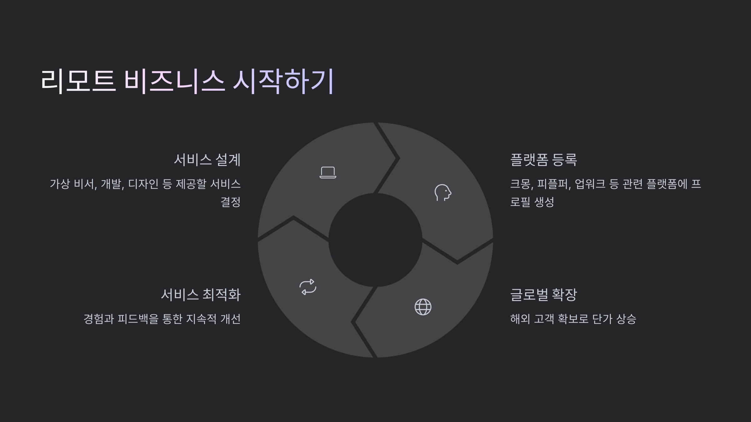 리모트 비즈니스의 장점은 유연성과 확장성에 있어요. 하나의 제품이나 서비스를 잘 만들면, 전 세계 고객을 대상으로 판매할 수 있어요. 나만의 브랜드나 셀프 마케팅 전략이 있다면 그야말로 ‘작은 기업’이 될 수 있어요.