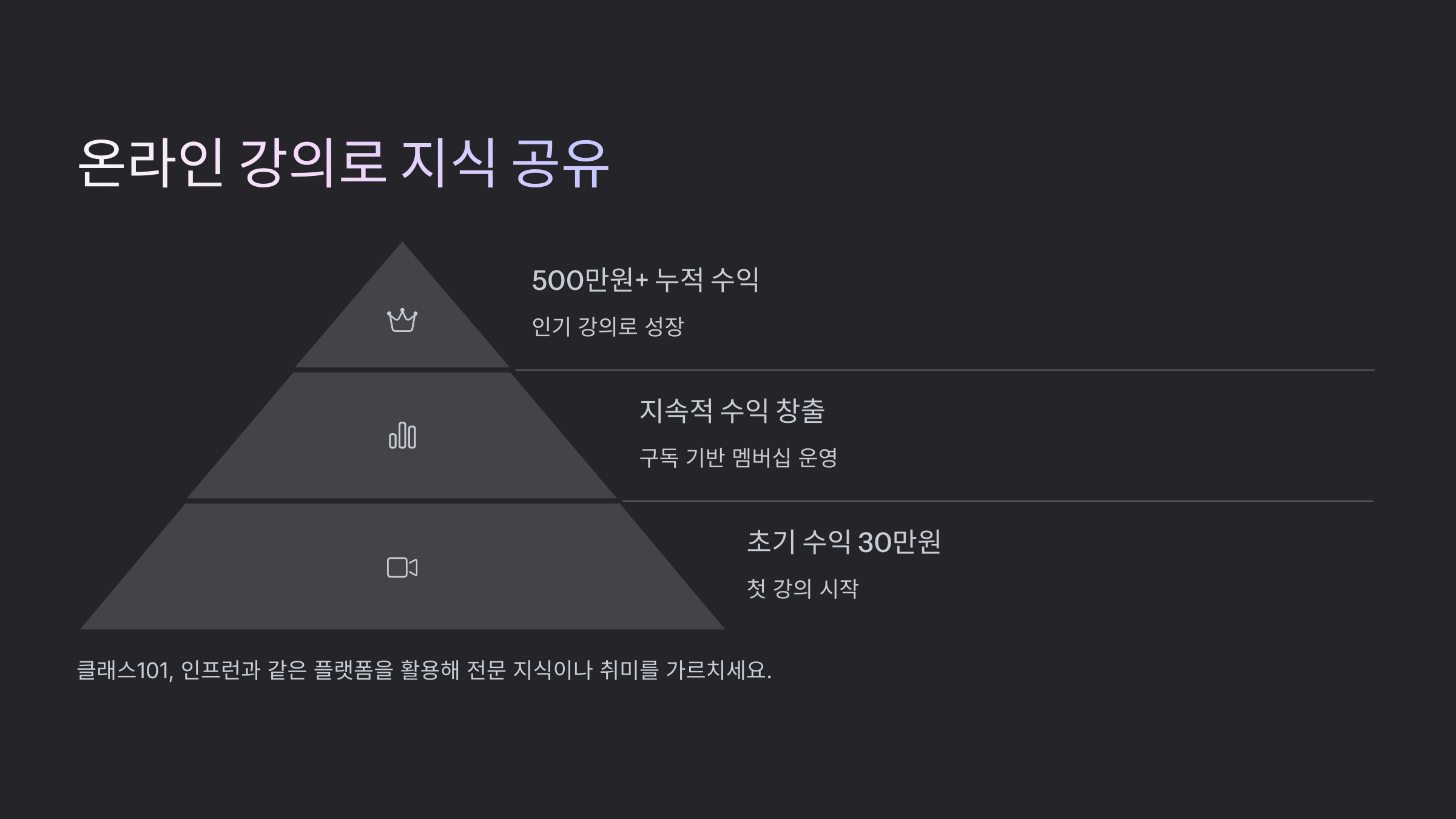 수익 구조도 좋아요. 기본적으로 수강료에서 일정 수수료를 제하고 정산되며, 일부 플랫폼은 인기도에 따라 추가 수익 보너스도 지급해요. 또 온라인 강의 콘텐츠는 한 번 만들고 나면 반복 판매가 가능하므로, 디지털 자산처럼 수동 소득을 기대할 수 있답니다.