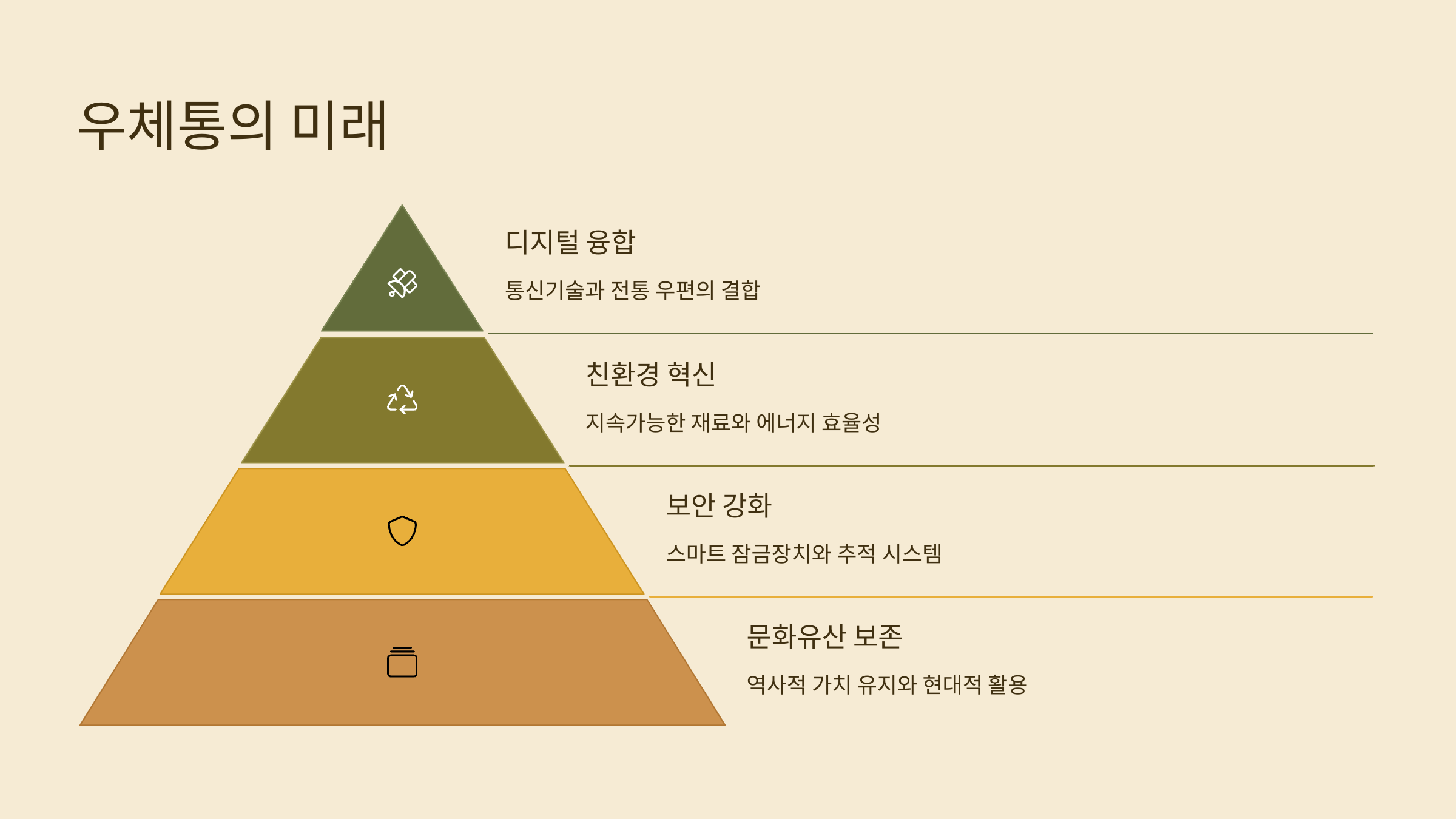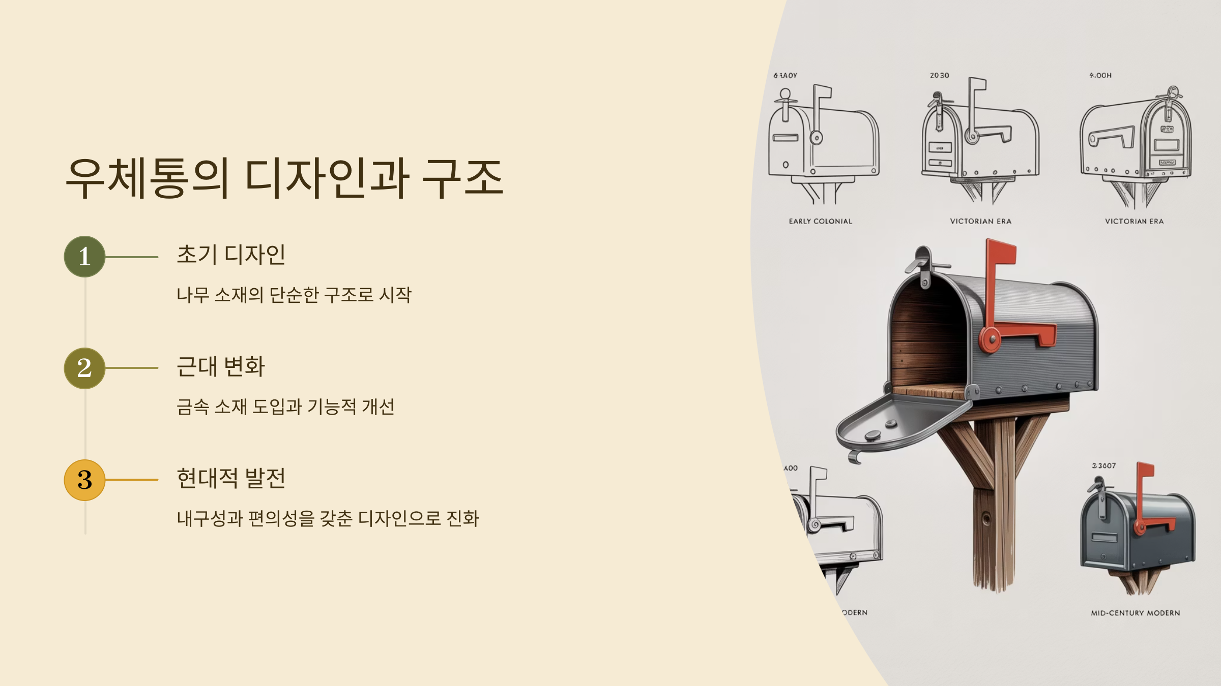 구분 전통 우체통 현대 스마트 우체통 기능 편지 수거 자동 수거 알림, 실시간 추적 디자인 고전적인 외형 미니멀/하이테크 소재 철재, 목재 스테인리스, 플라스틱, 태양광 패널 설치 장소 거리, 마을 입구 스마트 시티, 공공기관 이처럼 우체통은 '기계'에서 '스마트 서비스 플랫폼'으로 진화 중이에요. 변화의 흐름 속에서도 여전히 사람 중심의 기능과 감성을 잊지 않는 점이 인상적이죠. 💼📨