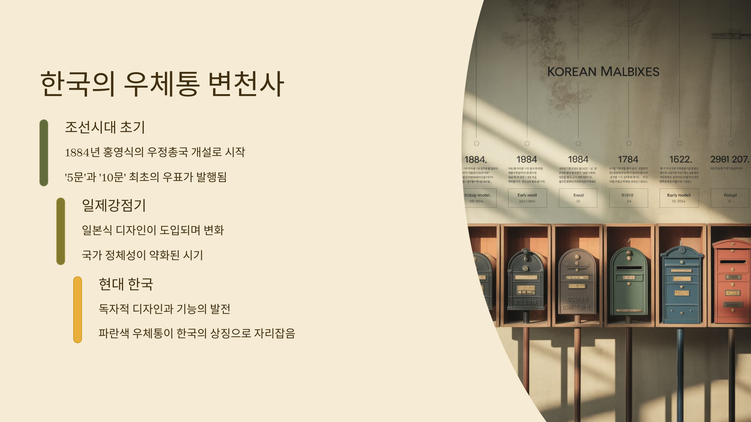 일제강점기에는 일본식 원통형 우체통이 전국에 설치되기 시작했어요. 이 시기의 우체통은 '국영우편' 시스템을 상징했지만, 해방 이후 대한민국 정부 수립과 함께 독자적인 디자인과 시스템을 구축해나갔죠. 1960~70년대 산업화와 함께 우체통도 기하급수적으로 늘어났어요.
