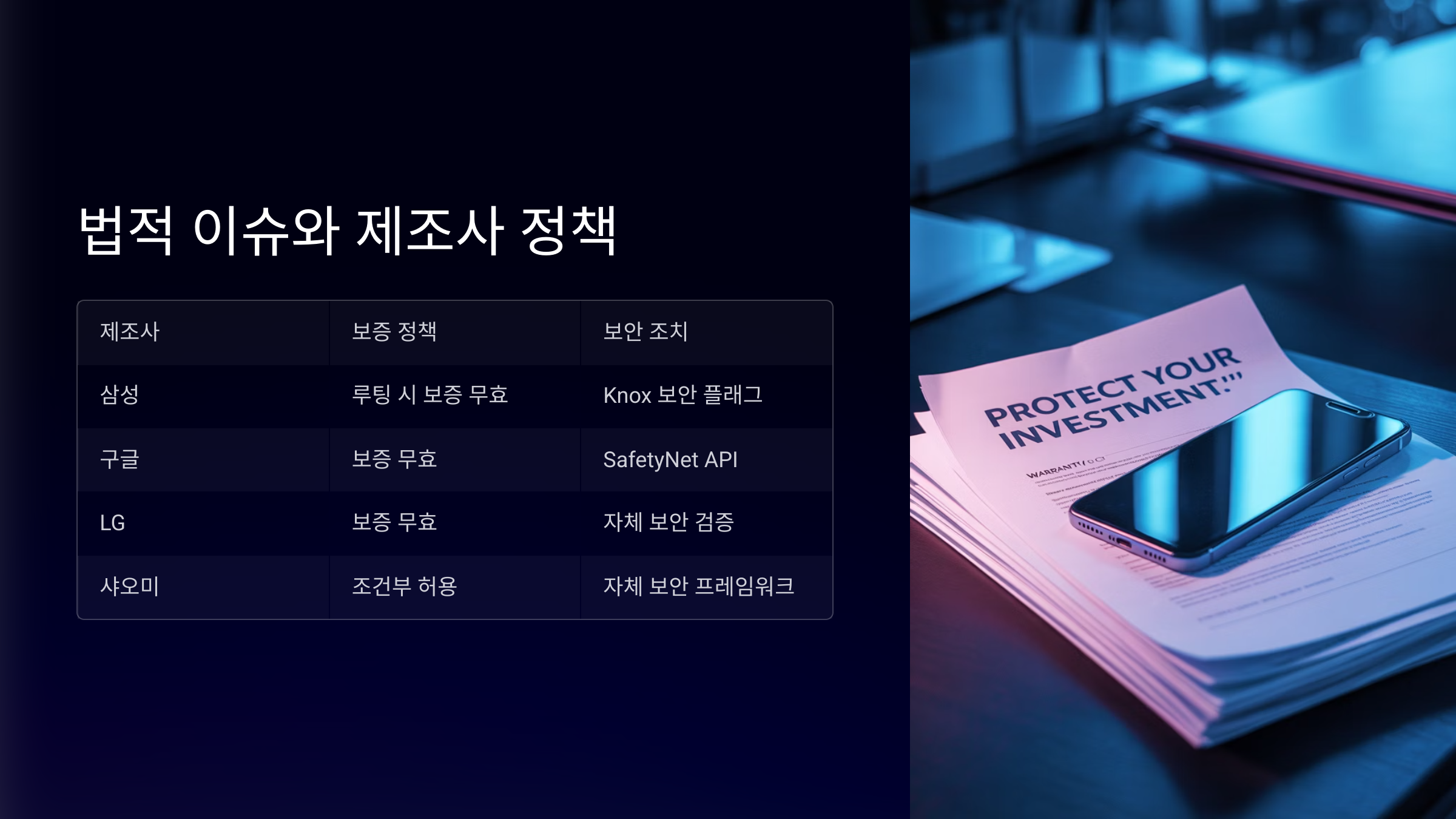 삼성전자, LG전자(현재는 모바일 사업 종료), 샤오미, 화웨이 등 대부분의 제조사들은 ‘부트로더 언락 및 루팅 시 보증이 무효화된다’는 정책을 운영하고 있어요. 특히 삼성의 Knox 보안 시스템은 루팅 여부를 추적해서, 루팅 흔적이 있으면 삼성페이와 보안 기능을 영구 차단해요.