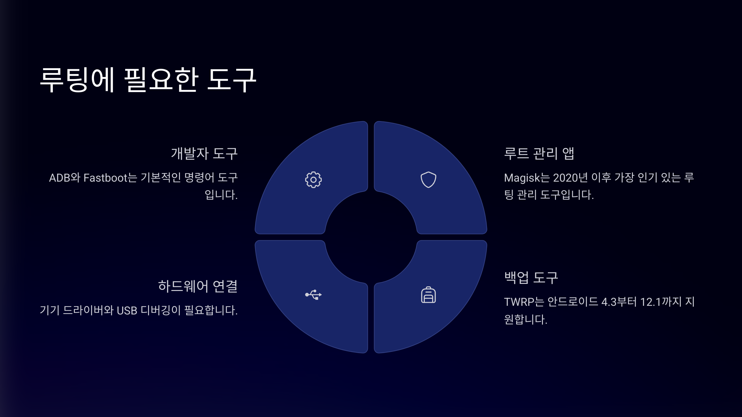 루팅을 성공적으로 하기 위해서는 몇 가지 필수 도구들이 필요해요. 첫 번째는 ADB & Fastboot 도구예요. 이는 안드로이드 개발자 도구(Android SDK)에 포함된 명령어 도구로, USB 연결을 통해 스마트폰에 명령을 내릴 수 있게 해줘요. 대부분의 루팅 작업은 이 ADB와 Fastboot로 시작된다고 보면 돼요.두 번째는 커스텀 리커버리 이미지인데, 대부분의 사용자는 TWRP를 사용해요. 이 리커버리를 통해 루팅 툴을 설치하거나 백업을 진행할 수 있어요. 기기 모델에 맞는 버전을 정확히 설치하는 게 중요하고, 최신 TWRP를 사용하는 것이 안정성을 높여줘요.