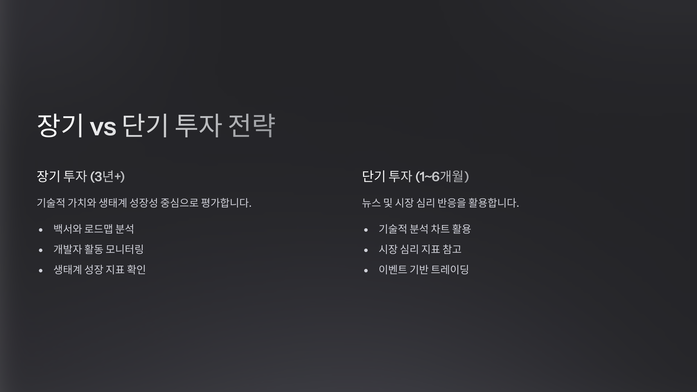 항목 단기 투자 장기 투자 투자 기간 1일~1개월 6개월~수년 수익 방식 시세 차익 가치 상승, 프로젝트 성장 리스크 높음 비교적 낮음 시간 투자 많음 적음 추천 대상 경험자, 트레이딩 가능자 초보자, 직장인 결론적으로 두 전략 중 하나를 고집할 필요는 없어요. 일부 자산은 단기로, 나머지는 장기로 운용하는 '하이브리드 전략'도 충분히 가능하니까요. 나만의 투자 스타일을 찾는 것, 그게 가장 중요한 첫걸음이에요! 💡💼