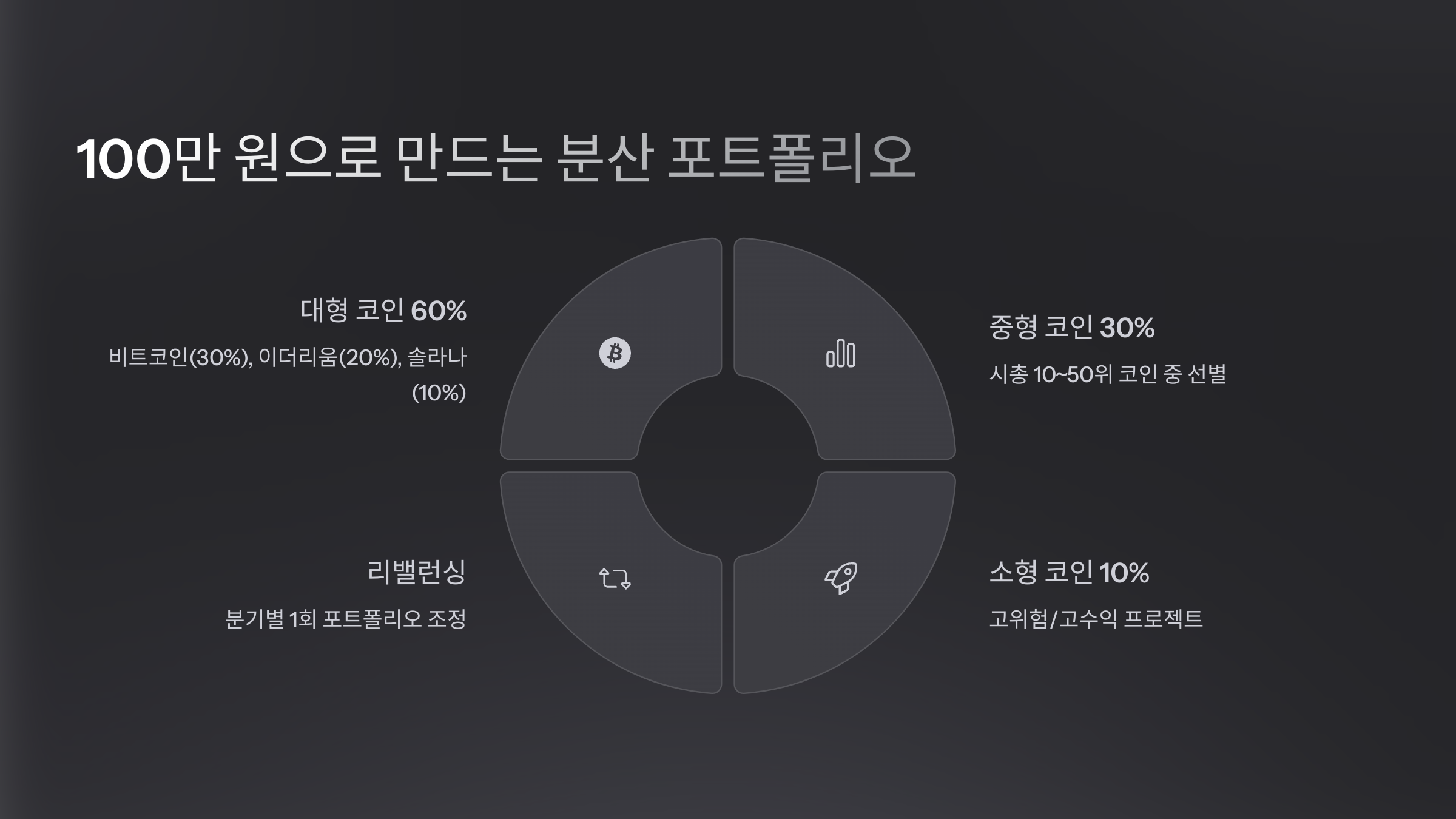 추천 포트폴리오는 다음과 같아요: 비트코인 40만 원, 이더리움 30만 원, 유망 알트코인 30만 원이에요. 이 비중은 안전성과 성장 가능성을 동시에 고려한 구성이라 입문자에게 적합해요. 알트코인은 솔라나(SOL), 체인링크(LINK), 아발란체(AVAX) 같은 검증된 프로젝트를 고려할 수 있어요.