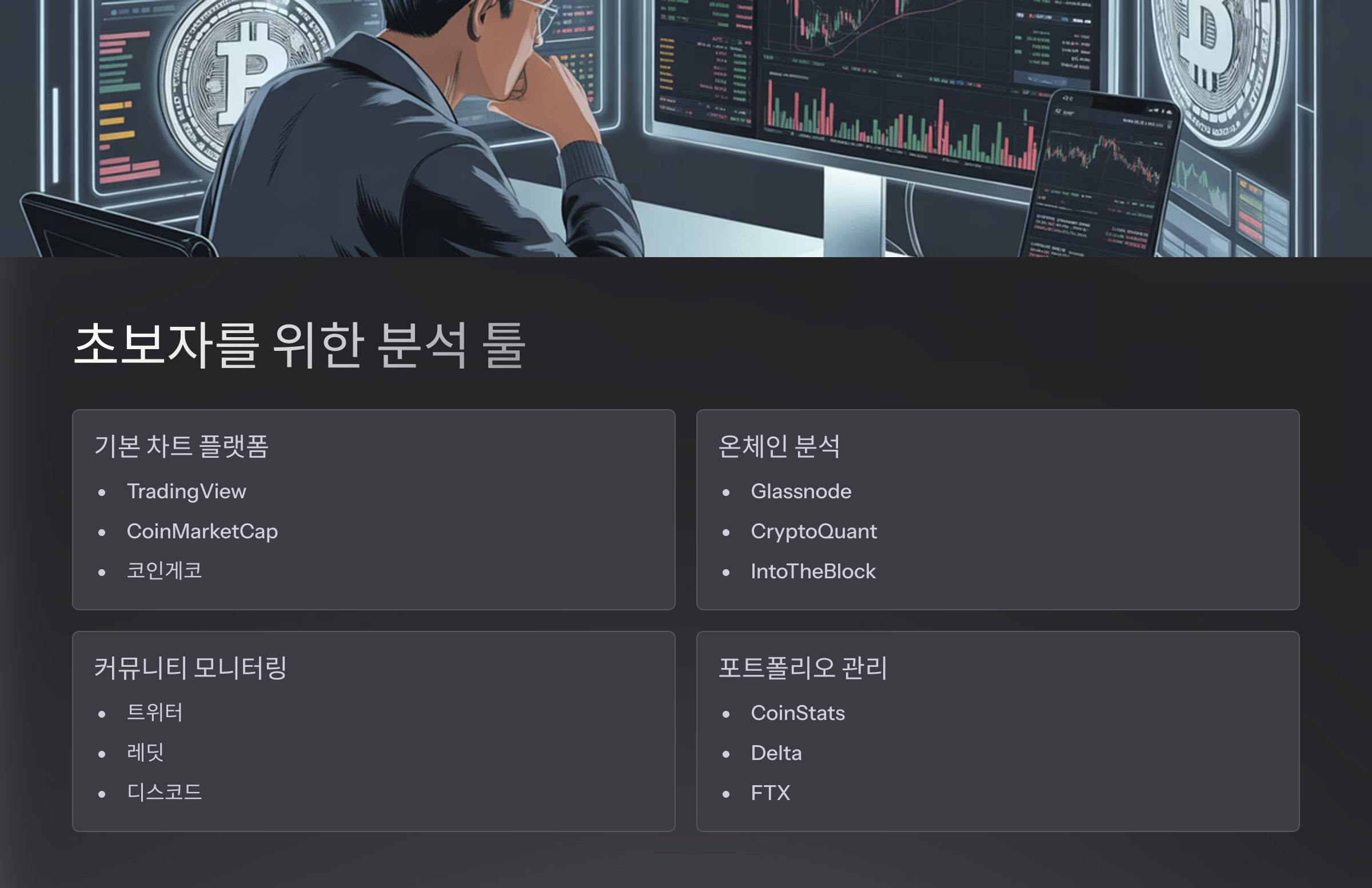 도구명 기능 요약 추천 이유 CoinMarketCap 실시간 시세, 거래소 정보, 백서 기초 정보 파악에 최적화 TradingView 차트 분석, 기술 지표 적용 직관적인 UI로 초보자도 활용 가능 CoinGecko 개발 활동, 커뮤니티 추이 신뢰도 및 장기성 판단 가능 이 밖에도 CryptoPanic 같은 뉴스 알림 툴, Glassnode 같은 온체인 분석 플랫폼도 있어요. 너무 많은 정보를 한꺼번에 보려 하기보다는, 하나씩 익숙해지는 것이 좋아요. 일단 코인마켓캡과 트레이딩뷰만 잘 써도 절반은 먹고 들어가요! 🎯📈