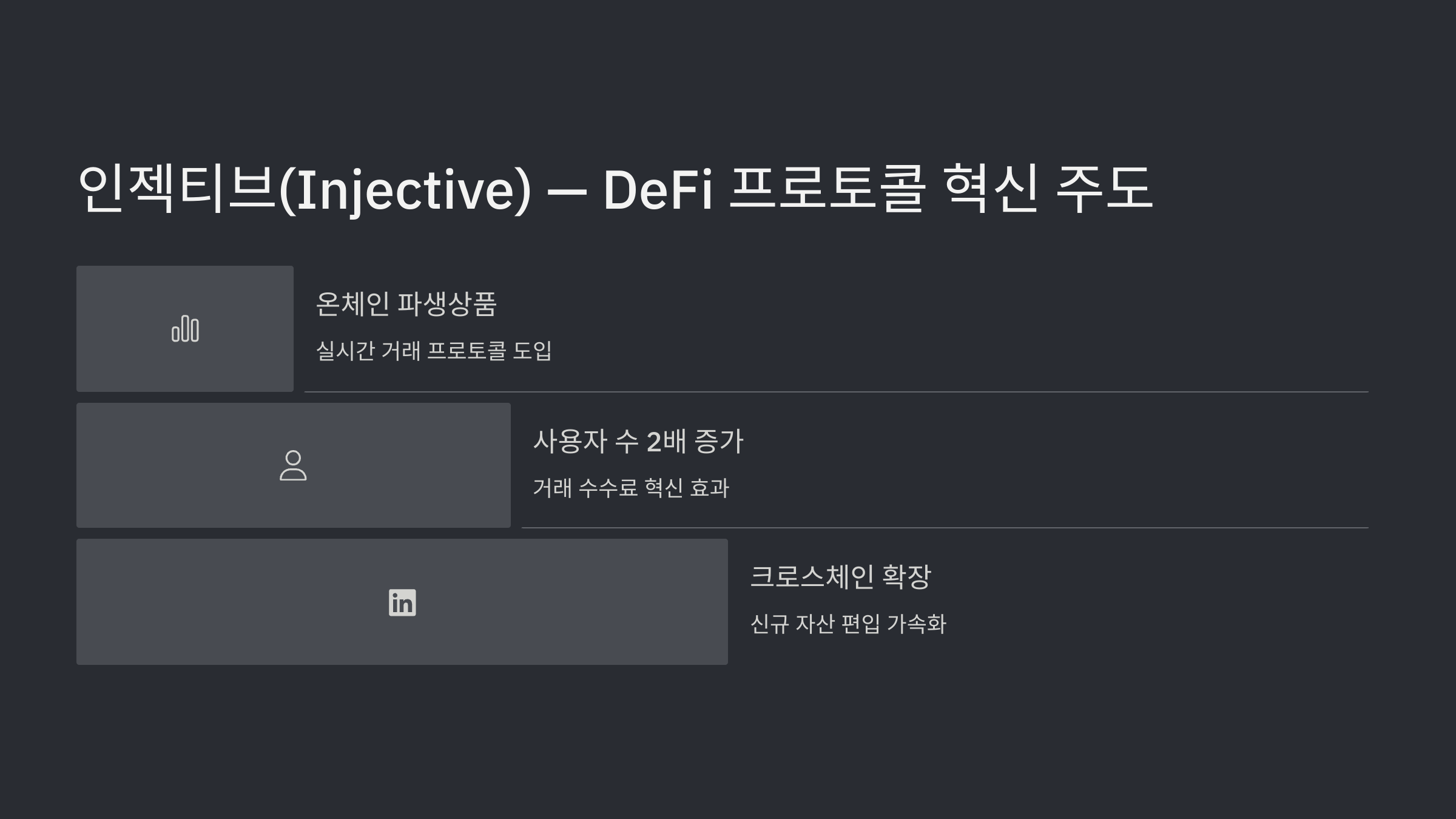 플랫폼 트랜잭션 속도 지원 자산 특징 토큰 활용성 Injective 9,000+ TPS 파생상품, 스테이블코인, NFT 완전 온체인 거래 거버넌스 + 수수료 Uniswap 30~100 TPS ERC-20 중심 AMM 기반 LP 보상 중심 SushiSwap 25~50 TPS 다양한 체인 지원 수익 공유 기능 수수료 보상 인젝티브는 단순한 DEX가 아니라, 파생상품 + NFT + 구조화 금융까지 아우르는 올인원 플랫폼으로 진화 중이에요. 특히 자체 토큰 생태계를 구축하고 있고, 거버넌스 참여율도 높기 때문에 커뮤니티 기반 성장 모델이 강력하답니다.