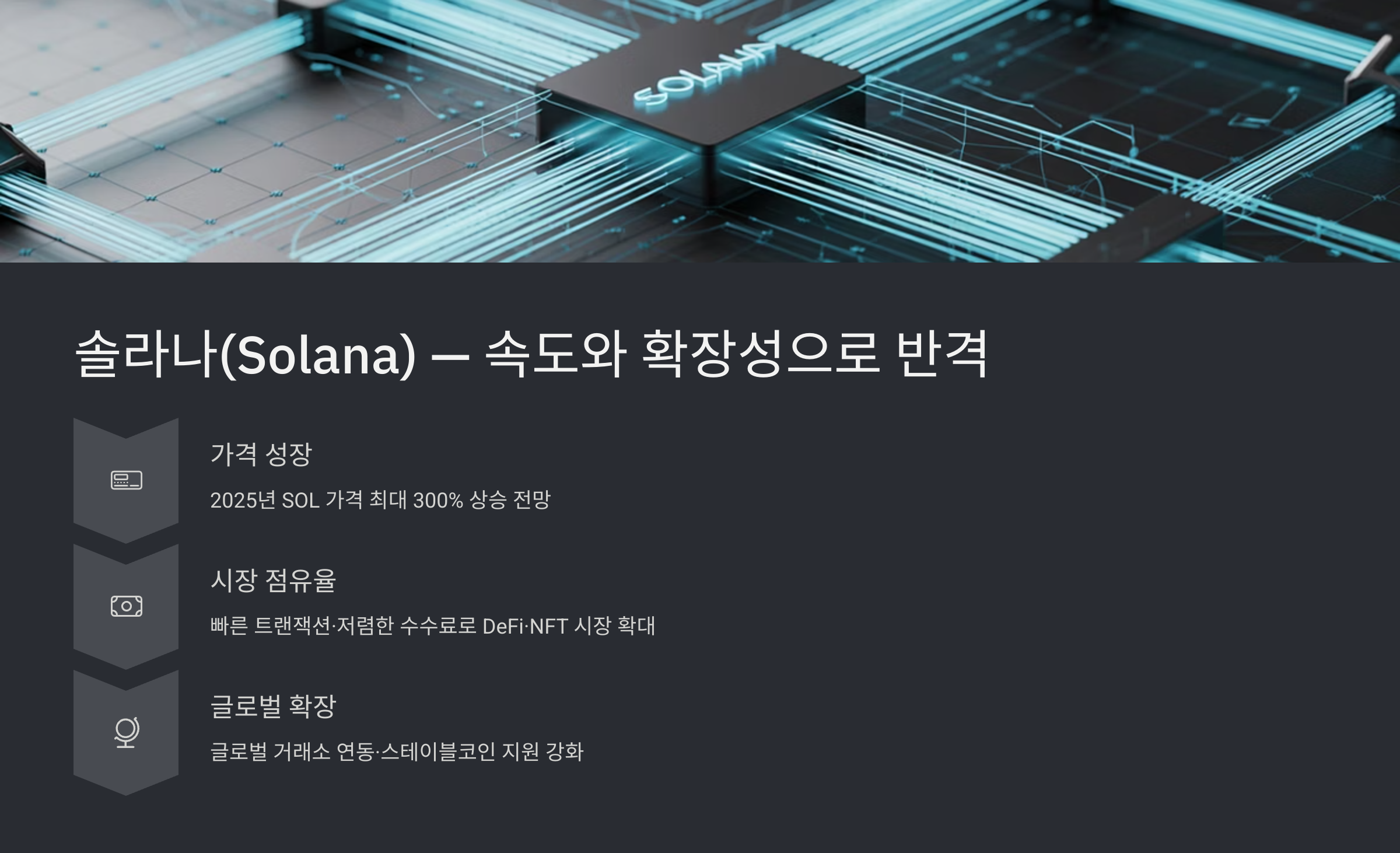 솔라나(Solana)의 반격 솔라나는 2021년 대세였지만, 한때는 다운타임과 해킹 문제로 신뢰를 잃기도 했어요. 하지만 2024년부터 본격적인 반등이 시작되었고, 2025년에는 ‘이더리움 대항마’라는 말이 다시 나오고 있답니다. 초당 수천 건의 거래가 가능한 속도와 낮은 수수료가 솔라나의 가장 큰 무기예요.