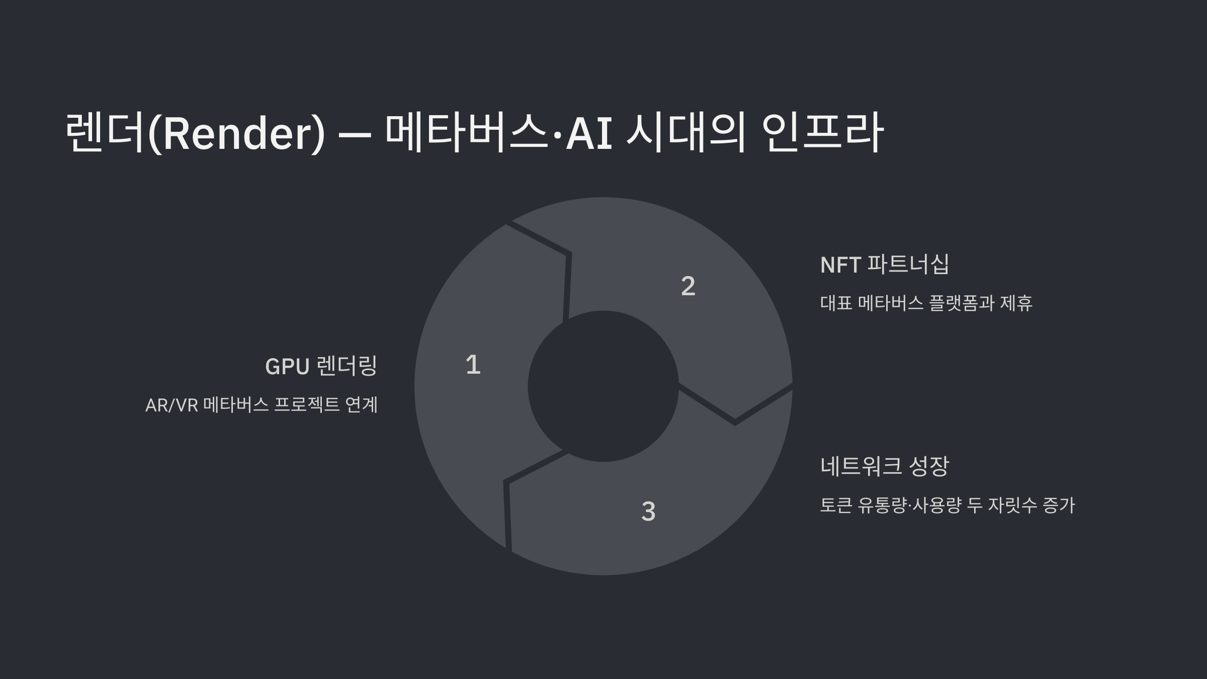 렌더(Render)는 말 그대로 '렌더링 파워'를 탈중앙화한 프로젝트예요. 메타버스, AI, 게임, 영화 분야 등에서 사용되는 무거운 3D 그래픽 데이터를 빠르게 처리할 수 있도록 분산형 GPU 네트워크를 제공하죠. 즉, 전 세계의 유휴 그래픽카드를 연결해서 하나의 슈퍼컴퓨터처럼 만드는 개념이에요.2025년, AI 생성 이미지와 메타버스 콘텐츠가 급증하면서 렌더의 수요는 상상 이상으로 높아졌어요. OpenAI, Nvidia, Unity 같은 기업들도 분산 렌더링을 채택하는 흐름 속에서, RNDR 코인은 이 생태계의 중심 코인으로 자리 잡았어요.