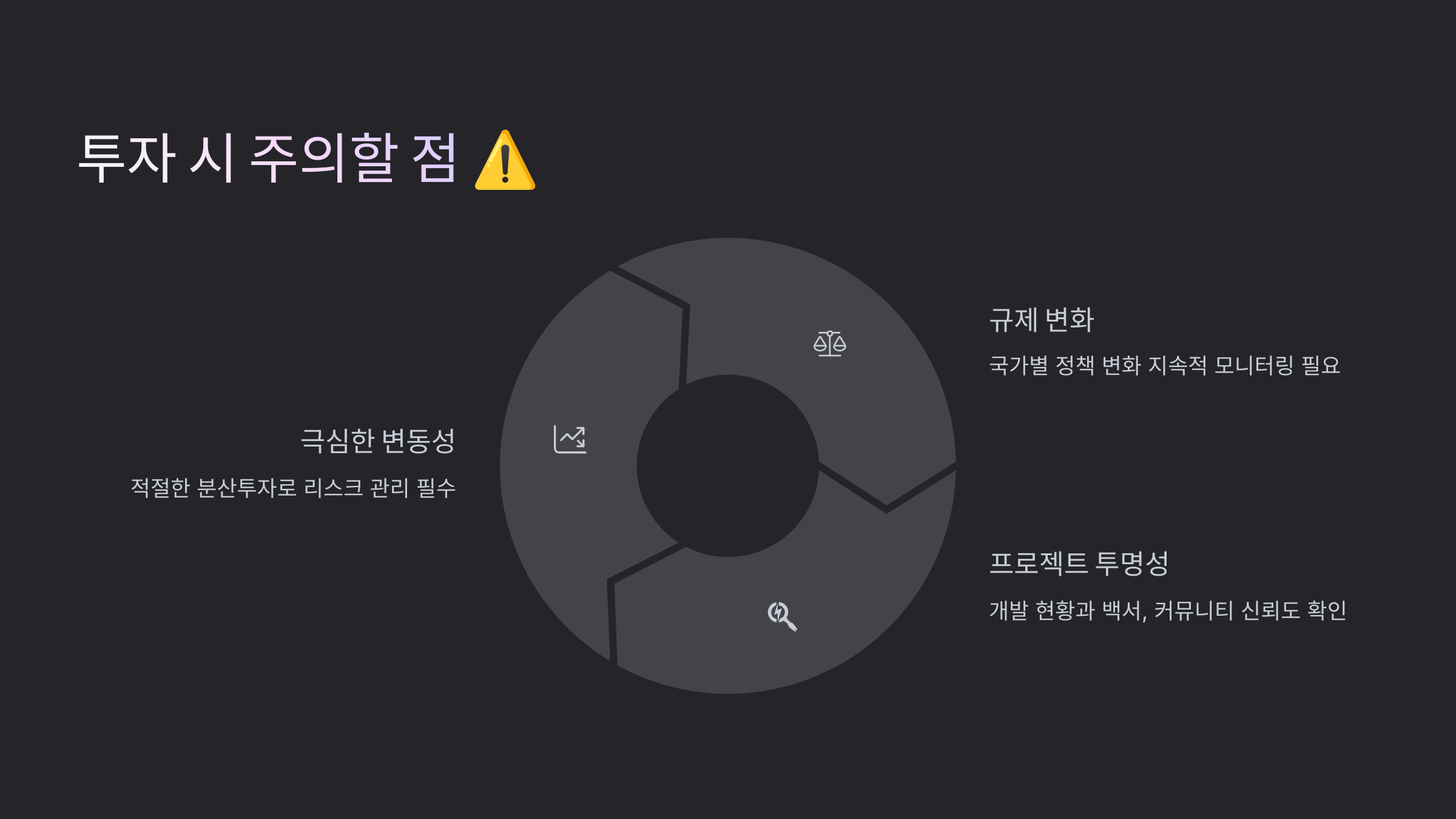이제 마지막으로, 투자할 때 반드시 알고 있어야 할 ‘주의점’을 확인해볼 차례예요. 아무리 유망한 코인이라도 리스크는 존재하니까요! ⚠