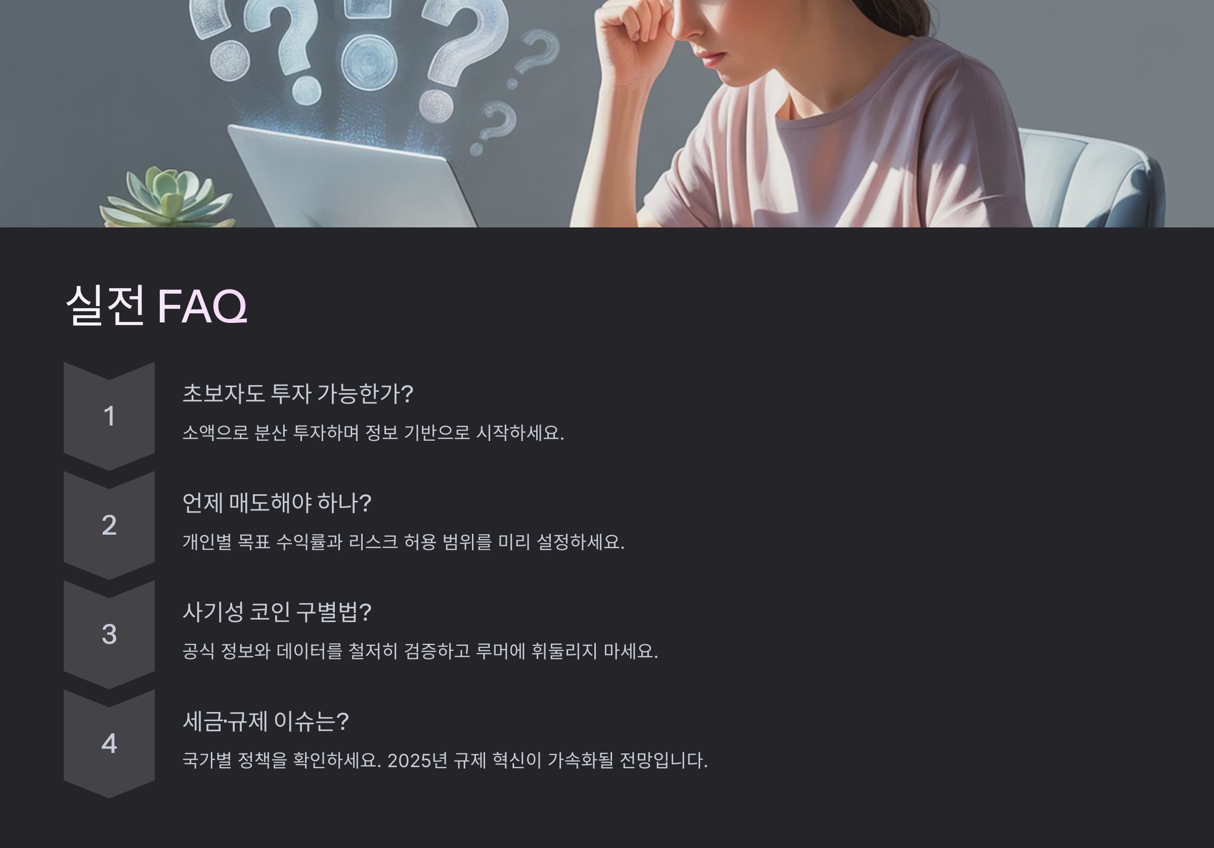 전망 항목 내용 요약 기대 시기 ETF 확대 이더리움 ETF 승인 가능성, 기관 참여 증가 2025년 하반기 기관 투자 확대 연기금, 헤지펀드 진입 본격화 2025~2026년 블록체인 실생활 적용 정부 행정, 의료, 게임 분야 확산 2026년 메타버스 재부각 애플, 메타의 XR 기술 상용화 2025년 말 이 표처럼 다양한 변수들이 시장을 움직이고 있어요. 모든 게 불확실해 보일 수도 있지만, 이런 흐름들을 미리 알고 준비하면 훨씬 유리한 포지션을 가질 수 있어요. 무조건 '언제 오를까?'만 바라보는 것보다, 어떻게 대응할까를 고민하는 게 훨씬 더 현명한 방법이에요 💼
