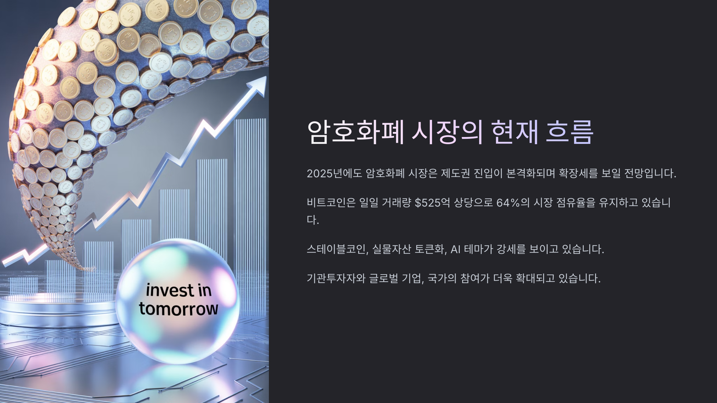 2025년의 암호화폐 시장은 2021년의 과열과 2022년의 조정을 모두 지나, 이제는 '성숙기'로 접어들었다는 평가를 받고 있어요. 특히 각국 정부가 규제를 정비하고, 기관 투자자들이 속속 시장에 진입하면서 시장의 안정성과 신뢰도가 크게 올라갔답니다. 블랙록, 피델리티 같은 전통 금융 기관들도 비트코인 ETF를 시작으로 다양한 암호화폐 상품에 손을 대고 있어요.이러한 변화는 단순히 가격에 영향을 주는 것을 넘어서, 암호화폐가 실제 금융 시스템의 한 축으로 자리 잡고 있다는 걸 보여줘요. 예전에는 '투기성 자산'이라는 인식이 강했다면, 이제는 '디지털 자산', '웹3 생태계의 자산'으로 불리며 전문 자산군으로 인정받고 있죠.