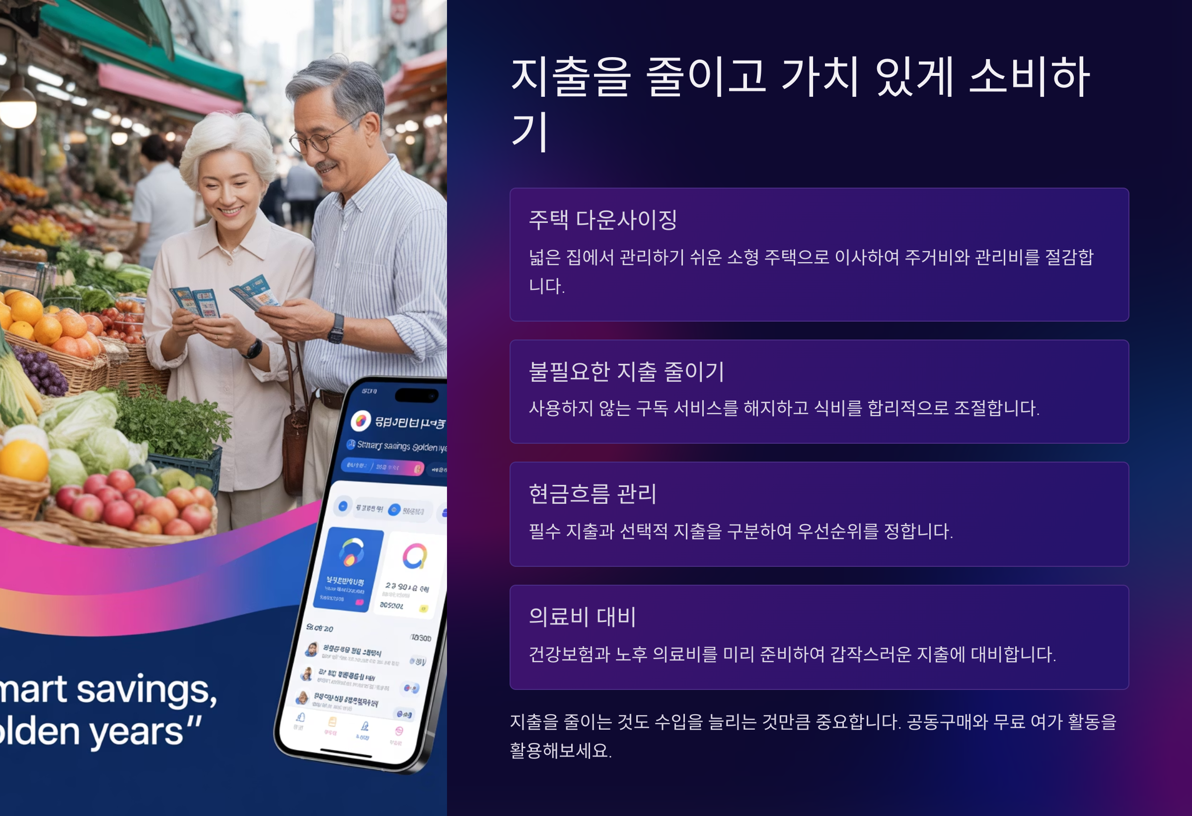 또한 문화생활비는 지자체나 복지관에서 제공하는 무료 프로그램을 활용하면 만족도 높은 취미 생활도 가능해요. 사소한 지출을 줄이면, 월 30만 원 이상 절약할 수 있답니다.