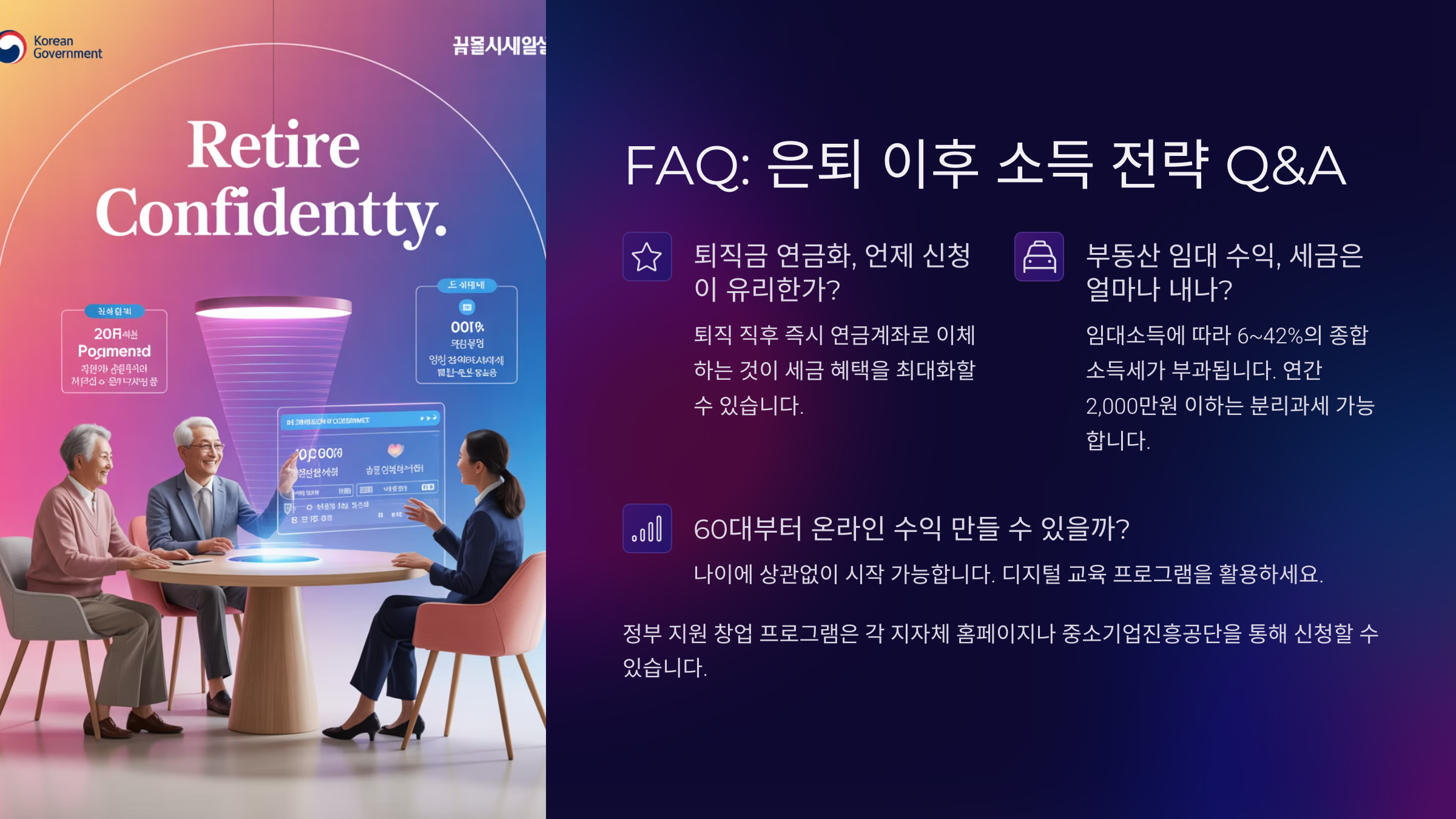 Q1. 퇴직 후 연금 외 수입은 어떻게 만들 수 있을까요?A1. 금융 상품, 부동산 월세, 소자본 창업, 온라인 플랫폼 등을 활용해 추가 수입을 만들 수 있어요.
