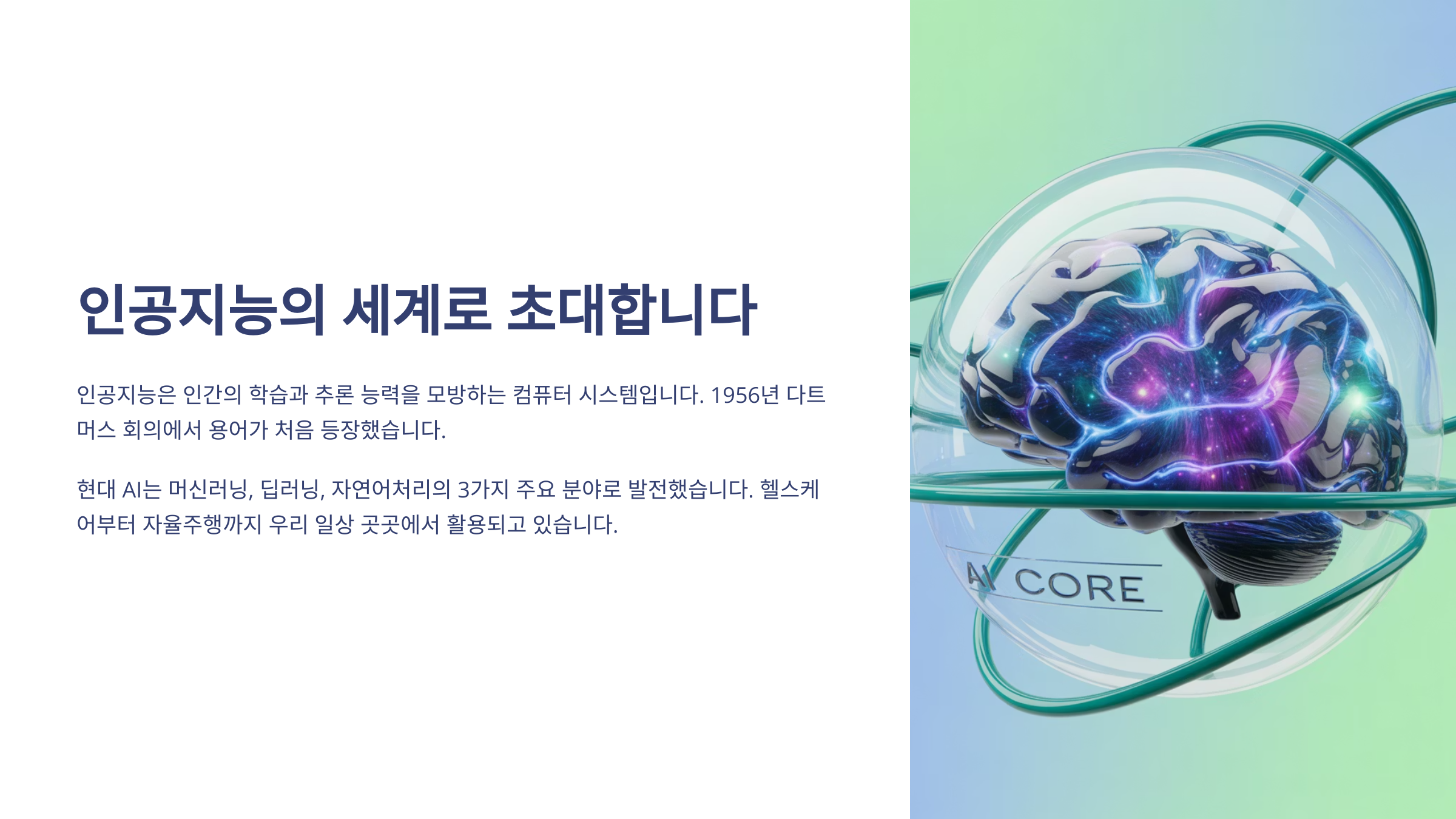 구분 설명 약한 AI 특정 작업 전문 AI 강한 AI 인간처럼 사고 가능한 AI 🎯 지금 바로 AI의 세계를 만나보세요!