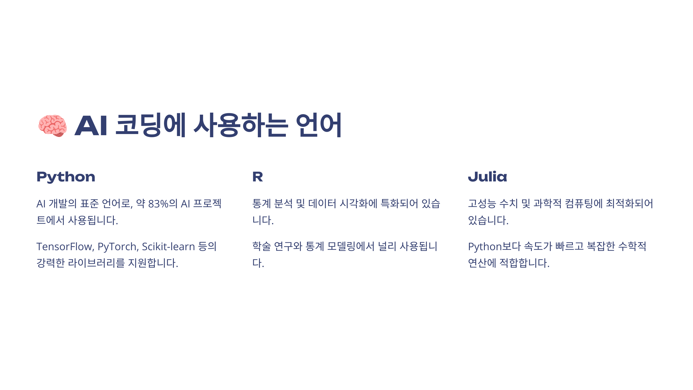 AI를 만들기 위해선 특별한 프로그래밍 언어를 배워야 해요. 가장 인기 있는 언어는 '파이썬(Python)'이에요. 문법이 간단하고 다양한 AI 라이브러리가 있어서 입문자에게 딱이죠.