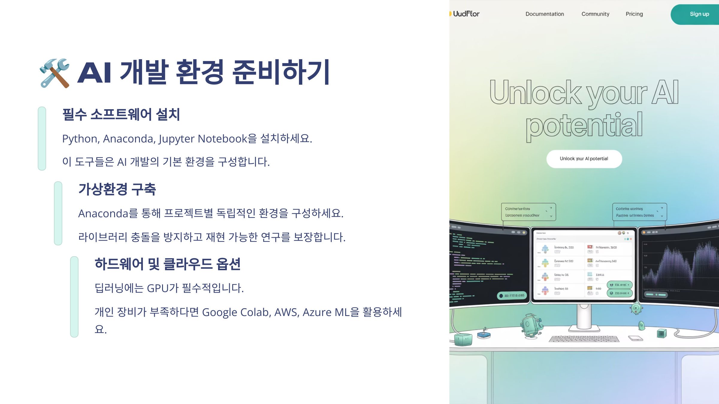 AI 코딩을 시작하려면 개발 환경을 준비해야 해요. 어렵지 않으니 걱정하지 마세요! 가장 기본적으로는 컴퓨터와 파이썬 설치가 필요해요.