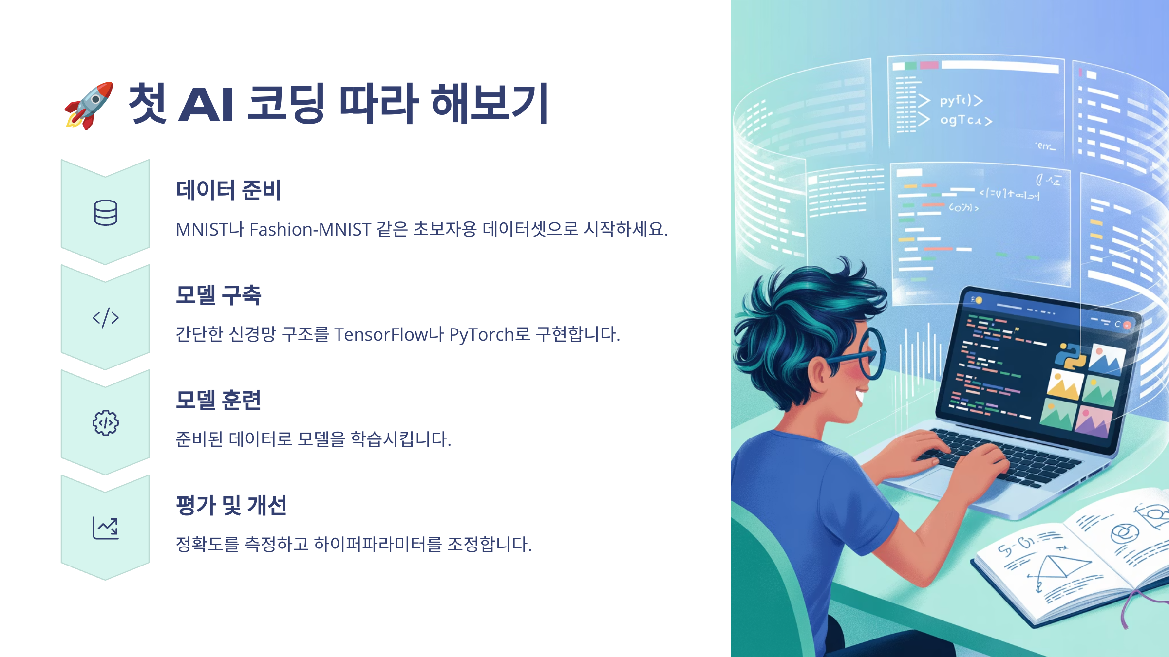 코딩을 처음 접한다면, 간단한 파이썬 문법부터 시작해서 AI 관련 코드를 하나하나 직접 따라 해보는 게 최고랍니다!
